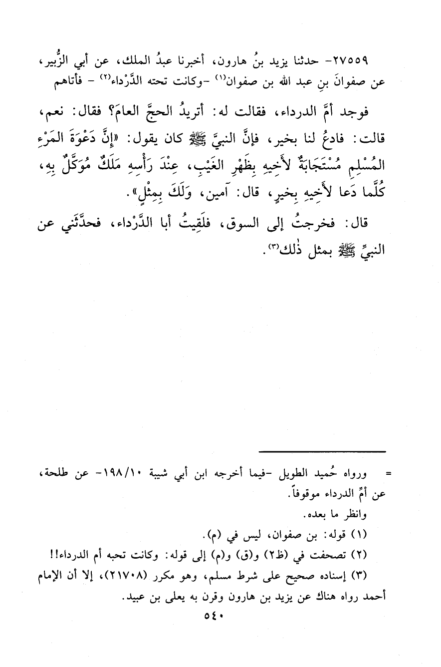٢٧٥٥٩ - حَدَّثَنَا يَزِيدُ بْنُ هَارُونَ، أَخْبَرَنَا عَبْدُ الْمَلِكِ، عَنْ أَبِي الزُّبَيْرِ، عَنْ صَفْوَانَ (١) بْنِ عَبْدِ اللهِ بْنِ صَفْوَانَ - وَكَانَتْ تَحْتَهُ الدَّرْدَاءُ (٢) - فَأَتَاهُمْ فَوَجَدَ أُمَّ الدَّرْدَاءِ فَقَالَتْ لَهُ: أَتُرِيدُ الْحَجَّ الْعَامَ؟ فَقَالَ: نَعَمْ قَالَتْ: فَادْعُ لَنَا بِخَيْرٍ، فَإِنَّ النَّبِيَّ صَلَّى اللهُ عَلَيْهِ وَسَلَّمَ كَانَ يَقُولُ: " إِنَّ دَعْوَةَ الْمَرْءِ الْمُسْلِمِ مُسْتَجَابَةٌ لِأَخِيهِ بِظَهْرِ الْغَيْبِ، عِنْدَ رَأْسِهِ مَلَكٌ مُوَكَّلٌ بِهِ كُلَّمَا دَعَا لِأَخِيهِ بِخَيْرٍ قَالَ: آمِينَ وَلَكَ بِمِثْلٍ " قَالَ: فَخَرَجْتُ إِلَى السُّوقِ فَلَقِيتُ أَبَا الدَّرْدَاءِ فَحَدَّثَنِي عَنِ النَّبِيِّ صَلَّى اللهُ عَلَيْهِ وَسَلَّمَ بِمِثْلِ ذَلِكَ (٣)