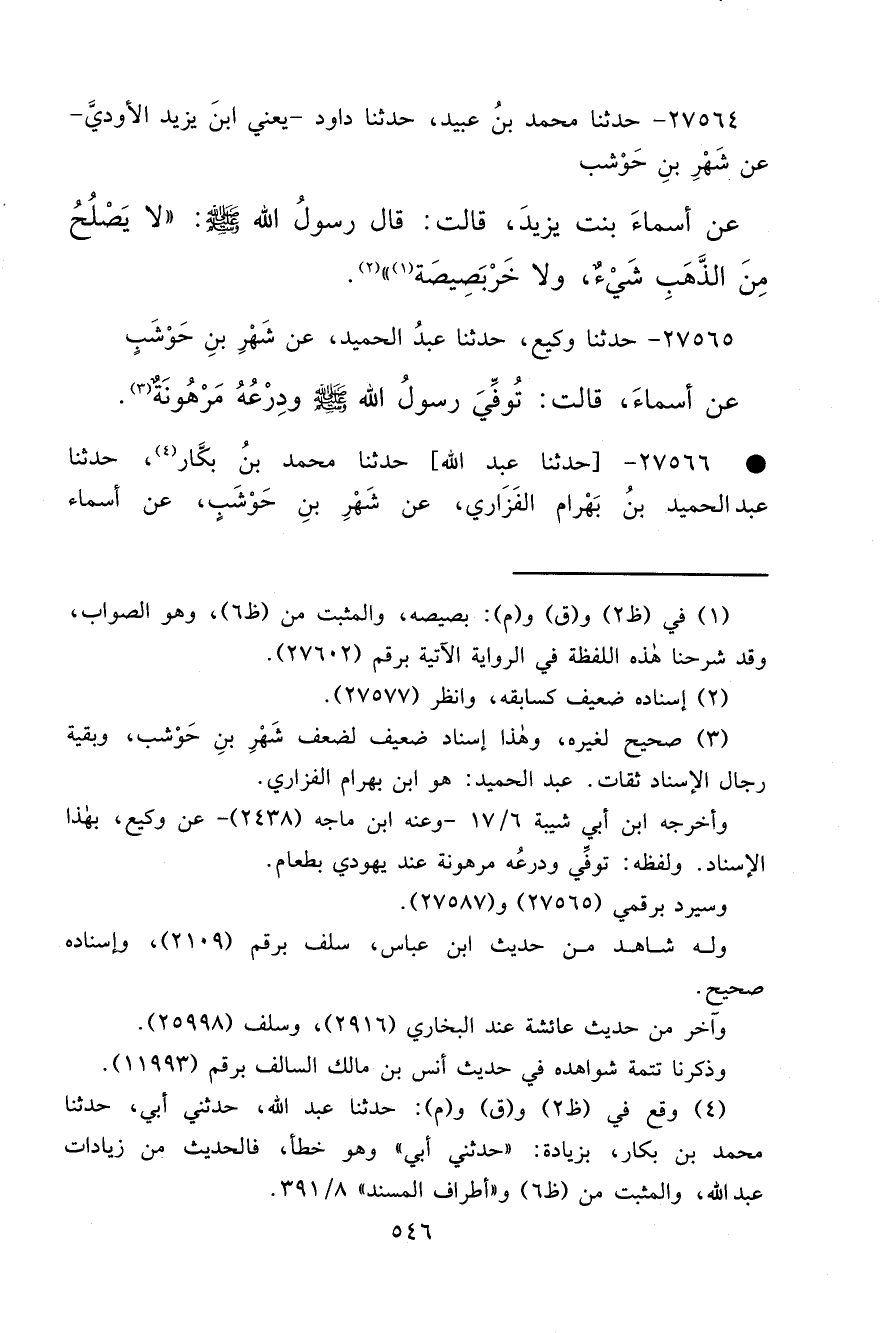 • ٢٧٥٦٦ -[حَدَّثَنَا عَبْدُ اللهِ] ، حَدَّثَنَا مُحَمَّدُ بْنُ بَكَّارٍ (٤) ، حَدَّثَنَا عَبْدُ الْحَمِيدِ بْنُ بَهْرَامَ الْفَزَارِيُّ، عَنْ شَهْرِ بْنِ حَوْشَبٍ، عَنْ أَسْمَاءَ