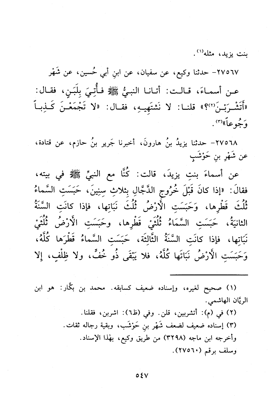 ٢٧٥٦٨ - حَدَّثَنَا يَزِيدُ بْنُ هَارُونَ، أَخْبَرَنَا جَرِيرُ بْنُ حَازِمٍ، عَنْ قَتَادَةَ، عَنْ شَهْرِ بْنِ حَوْشَبٍ، عَنْ أَسْمَاءَ بِنْتِ يَزِيدَ، قَالَتْ: كُنَّا مَعَ النَّبِيِّ صَلَّى اللهُ عَلَيْهِ وَسَلَّمَ فِي بَيْتِهِ فَقَالَ: " إِذَا كَانَ قَبْلَ خُرُوجِ الدَّجَّالِ بِثَلَاثِ سِنِينَ، حَبَسَتِ السَّمَاءُ ثُلُثَ قَطْرِهَا، وَحَبَسَتِ الْأَرْضُ ثُلُثَ نَبَاتِهَا، فَإِذَا كَانَتِ السَّنَةُ الثَّانِيَةُ حَبَسَتِ السَّمَاءُ ثُلُثَيْ قَطْرِهَا، وَحَبَسَتِ الْأَرْضُ ثُلُثَيْ نَبَاتِهَا، فَإِذَا كَانَتِ السَّنَةُ الثَّالِثَةُ حَبَسَتِ السَّمَاءُ قَطْرَهَا كُلَّهُ، وَحَبَسَتِ الْأَرْضُ نَبَاتَهَا كُلَّهُ، فَلَا يَبْقَى ذُو خُفٍّ، وَلَا ظِلْفٍ إِلَّا