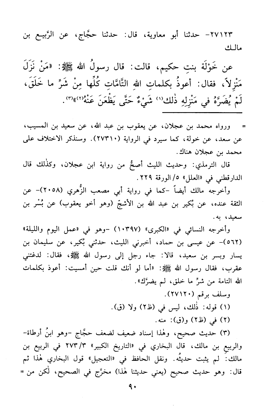 ٢٧١٢٣ - حَدَّثَنَا أَبُو مُعَاوِيَةَ، قَالَ: حَدَّثَنَا حَجَّاجٌ، عَنِ الرَّبِيعِ بْنِ مَالِكٍ، عَنْ خَوْلَةَ بِنْتِ حَكِيمٍ قَالَتْ: قَالَ رَسُولُ اللهِ صَلَّى اللهُ عَلَيْهِ وَسَلَّمَ: " مَنْ نَزَلَ مَنْزِلًا فَقَالَ: أَعُوذُ بِكَلِمَاتِ اللهِ التَّامَّاتِ كُلِّهَا مِنْ شَرِّ مَا خَلَقَ لَمْ يَضُرَّهُ فِي مَنْزِلِهِ ذَلِكَ (١) شَيْءٌ حَتَّى يَظْعَنَ عَنْهُ (٢) " (٣)