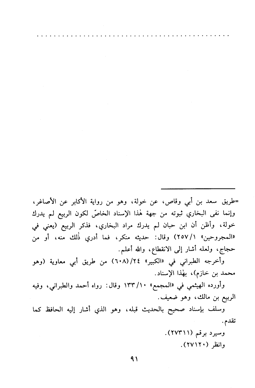 = طريق سعد بن أبي وقاص، عن خولة، وهو من رواية الأكابر عن الأصاغر، وإنما نفى البخاري ثبوته من جهة هذا الإسناد الخاصّ لكون الربيع لم يدرك خولة، وأظن أن ابن حبان لم يدرك مراد البخاري، فذكر الربيع (يعني في "المجروحين" ١/٢٥٧) وقال: حديثه منكر، فما أدري ذلك منه، أو من حجاج، ولعله أشار إلى الانقطاع، والله أعلم.