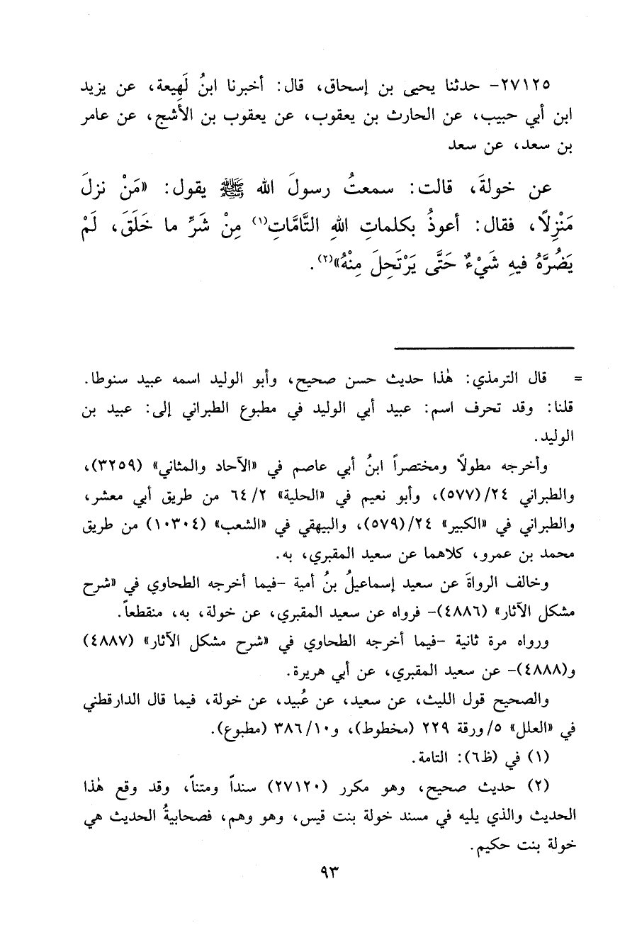 ٢٧١٢٥ - حَدَّثَنَا يَحْيَى بْنُ إِسْحَاقَ، قَالَ: أَخْبَرَنَا ابْنُ لَهِيعَةَ، عَنْ يَزِيدَ بْنِ أَبِي حَبِيبٍ، عَنِ الْحَارِثِ بْنِ يَعْقُوبَ، عَنْ يَعْقُوبَ بْنِ الْأَشَجِّ، عَنْ عَامِرِ بْنِ سَعْدٍ، عَنْ سَعْدٍ، عَنْ خَوْلَةَ قَالَتْ: سَمِعْتُ رَسُولَ اللهِ صَلَّى اللهُ عَلَيْهِ وَسَلَّمَ يَقُولُ: " مَنْ نَزَلَ مَنْزِلًا فَقَالَ: أَعُوذُ بِكَلِمَاتِ اللهِ التَّامَّاتِ (١) مِنْ شَرِّ مَا خَلَقَ، لَمْ يَضُرَّهُ فِيهِ شَيْءٌ حَتَّى يَرْتَحِلَ مِنْهُ "، (٢)