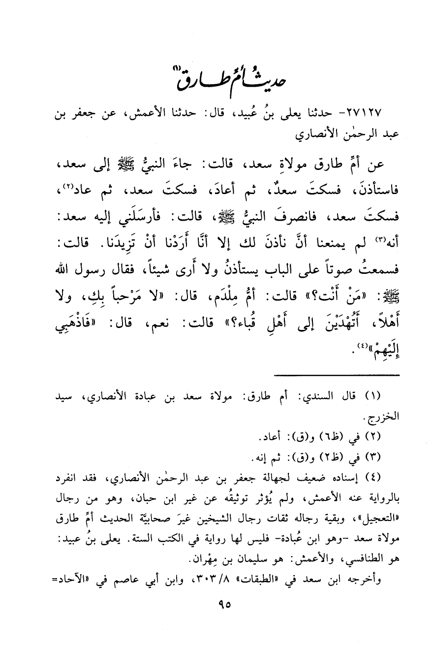 ٢٧١٢٧ - حَدَّثَنَا يَعْلَى بْنُ عُبَيْدٍ، قَالَ: حَدَّثَنَا الْأَعْمَشُ، عَنْ جَعْفَرِ بْنِ عَبْدِ الرَّحْمَنِ الْأَنْصَارِيِّ، عَنْ أُمِّ طَارِقٍ مَوْلَاةِ سَعْدٍ قَالَتْ: جَاءَ النَّبِيُّ صَلَّى اللهُ عَلَيْهِ وَسَلَّمَ إِلَى سَعْدٍ فَاسْتَأْذَنَ، فَسَكَتَ سَعْدٌ، ثُمَّ أَعَادَ فَسَكَتَ سَعْدٌ، ثُمَّ عَادَ (٢) فَسَكَتَ سَعْدٌ، فَانْصَرَفَ النَّبِيُّ صَلَّى اللهُ عَلَيْهِ وَسَلَّمَ قَالَتْ: فَأَرْسَلَنِي إِلَيْهِ سَعْدٌ: أَنَّهُ (٣) لَمْ يَمْنَعْنَا أَنْ نَأْذَنَ لَكَ إِلَّا أَنَّا أَرَدْنَا أَنْ تَزِيدَنَا، قَالَتْ: فَسَمِعْتُ صَوْتًا عَلَى الْبَابِ يَسْتَأْذِنُ وَلَا أَرَى شَيْئًا فَقَالَ رَسُولُ اللهِ صَلَّى اللهُ عَلَيْهِ وَسَلَّمَ: " مَنْ أَنْتِ؟ "، قَالَتْ: أُمُّ مِلْدَمٍ، قَالَ: " لَا مَرْحَبًا بِكِ، وَلَا أَهْلًا، أَتُهْدِينَ إِلَى أَهْلِ قُبَاءٍ؟ "، قَالَتْ: نَعَمْ، قَالَ: " فَاذْهَبِي إِلَيْهِمْ " (٤)