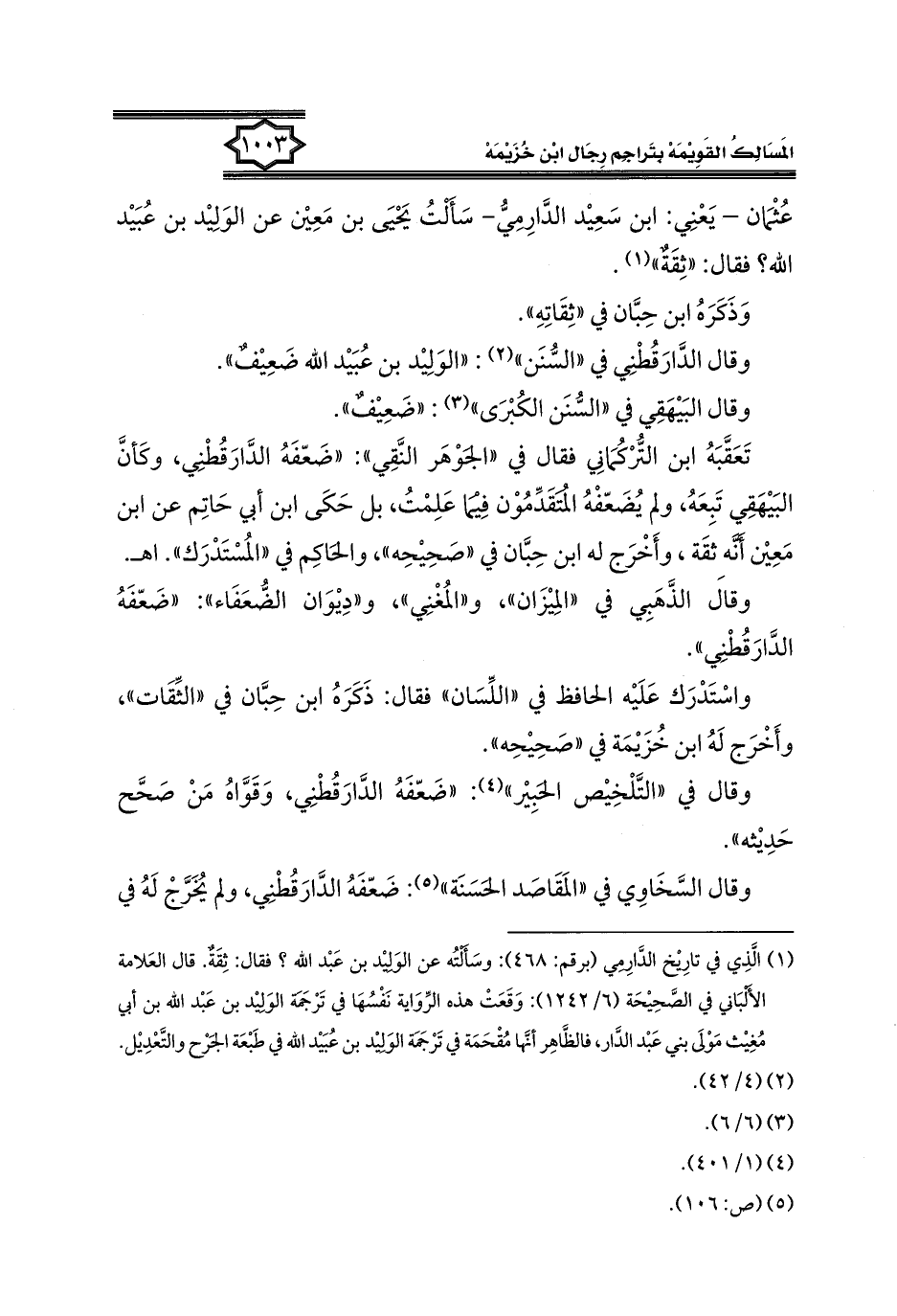 (١) الَّذِي في تاريخ الدَّارِمي (برقم: ٤٦٨): وسَألتُه عن الوَليْد بن عَبْد الله؟ فقال: ثِقَةٌ. قال العَلامة الألبَاني في الصَّحِيْحَة (٦/ ١٢٤٢): وَقَعَتْ هذه الرِّوَاية نَفْسُهَا في تَرْجَمة الوَليْد بن عَبْد الله بن أبي مُغِيْث مَوْلَى بني عَبْد الدَّار، فالظَّاهِر أنَّها مُقْحَمَة في تَرْجَمة الوَلِيد بن عُبَيْد الله في طَبْعَة الجرْح والتَّعْدِيل.