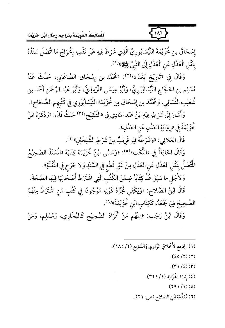 إِسْحَاقَ بن خُزَيْمَةَ النَّيْسَابُورِيِّ الَّذِي شَرَطَ فِيهِ عَلَى نَفْسِهِ إِخْرَاجَ مَا اتَّصَلَ سَنَدُهُ بِنَقْلِ الْعَدْلِ عَنِ الْعَدْلِ إِلَى النَّبِيِّ - صلى الله عليه وسلم -" (١).