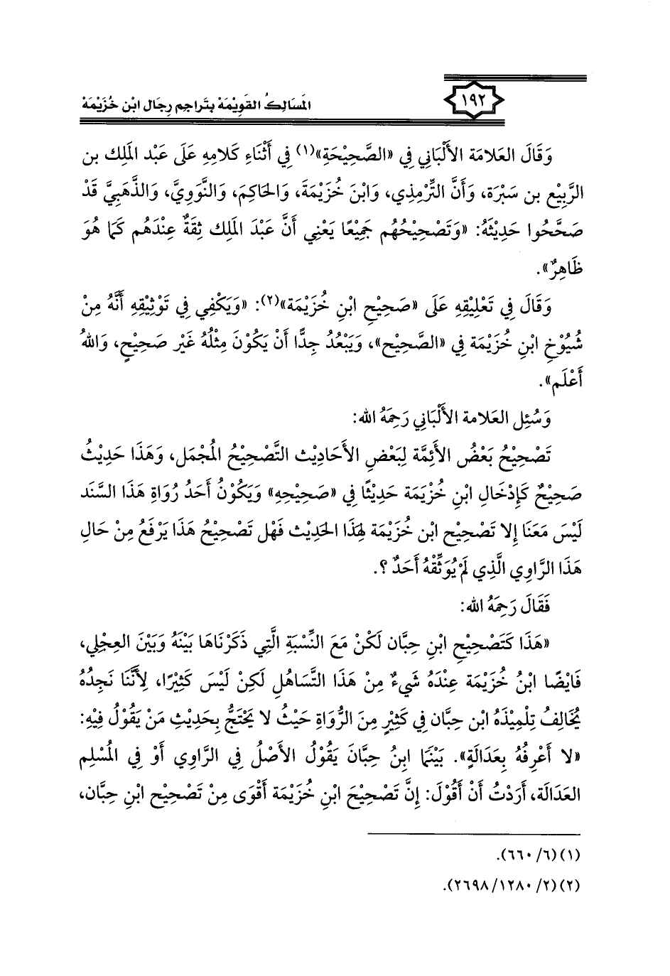 "هَذَا كَتَصْحِيْحِ ابْنِ حِبَّان لَكْنْ مَعَ النِّسْبَةِ الَّتِي ذَكَرْنَاهَا بَيْنَهُ وَبَيْنَ العِجْلِي، فَأَيْضًا ابْنُ خُزَيْمَة عِنْدَهُ شَيءٌ مِنْ هَذَا التَّسَاهُلِ لَكِنْ لَيْسَ كَثِيْرًا، لِأَنَّنَا نَجِدُهُ يُخَالِفُ تِلْمِيْذَهُ ابْن حِبَّان فِي كَثِيرٍ مِنَ الرُّوَاةِ حَيْثُ لا يَحْتَجُّ بِحَدِيْثِ مَنْ يَقُولُ فِيهِ: "أَعْرِفُهُ بِعَدَالَةٍ". بَيْنَمَا ابِنُ حِبَّانَ يَقُولُ الأَصْلُ فِي الرَّاوِي أَوْ فِي المُسْلِم العَدَالَة، أَرَدْتُ أَنْ أَقُوْلَ: إِنَّ تَصْحِيحَ ابْنِ خُزَيْمَة أَقْوَى مِنْ تَصْحِيْح ابْنِ حِبَّان،