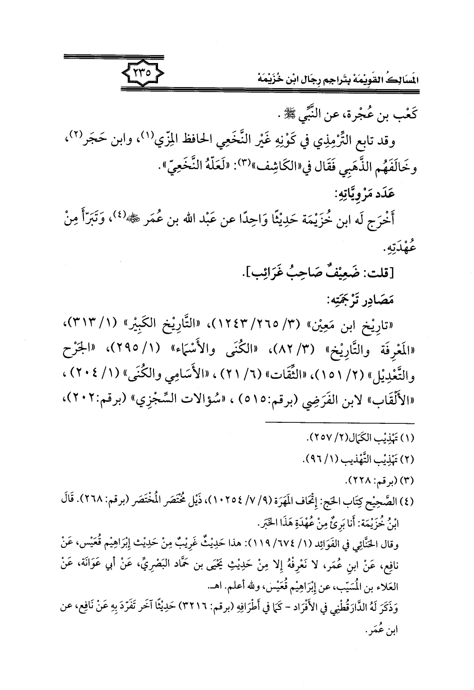 (٤) الصَّحِيح كِتَاب الحج: إِتْحَاف المَهَرَة (٩/ ٧/ ١٠٢٥٤)، ذَيْل مُختصَر المُخْتَصَر (برقم: ٢٦٨). قَالَ ابْنُ خُزَيْمَة: أَنا بَرِئٌ مِنْ عُهْدَةِ هَذَا الخَبَر.