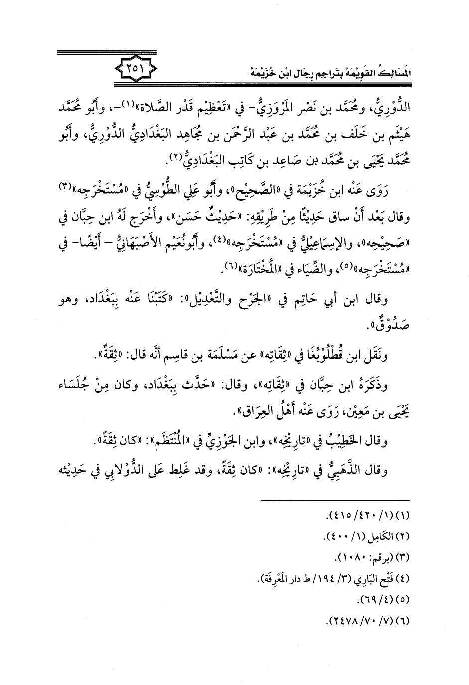 كتاب المسالك القويمة بتراجم رجال ابن خزيمة في الصحيح، والتوحيد، والفوائد (اسم الجزء: 1)