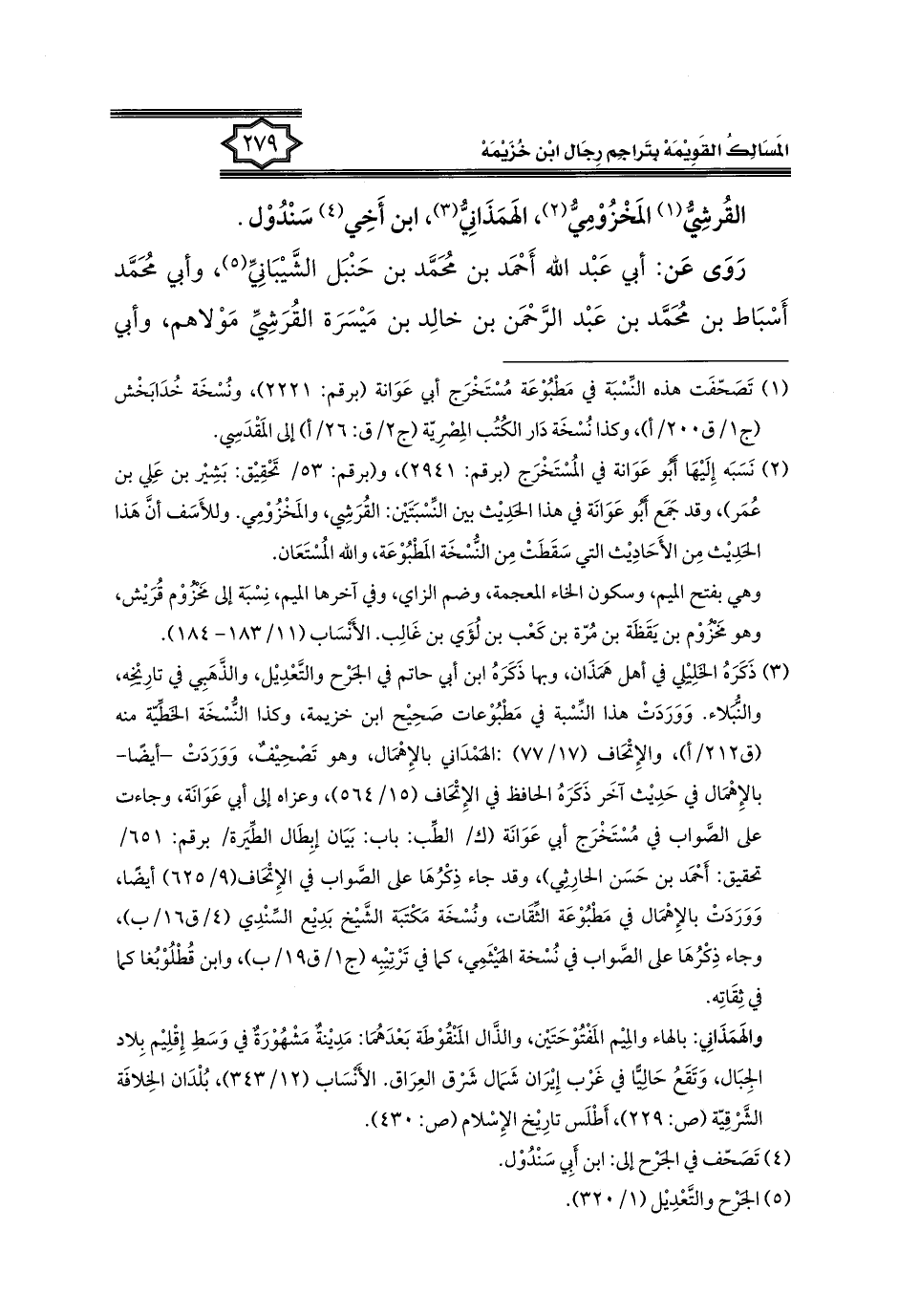 (٣) ذَكَرَهُ الخَلِيْلي في أهل هَمَذَان، وبها ذَكَرَهُ ابن أبي حاتم في الجرْح والتَّعْدِيل، والذَّهَبِي في تارِيْخِه، والنُّبَلاء. وَوَرَدَتْ هذا النِّسْبة في مَطْبُوعات صَحِيح ابن خزيمة، وكذا النُّسْخَة الخَطِّيّة منه (ق ٢١٢/ أ)، والإِتْحَاف (١٧/ ٧٧): الهَمْدَاني بالإِهْمَال، وهو تَصْحِيفٌ، وَوَرَدَتْ - أيضًا - بالإِهْمَال في حَدِيث آخَر ذَكَرَهُ الحافظ في الإِتْحَاف (١٥/ ٥٦٤)، وعزاه إلى أبي عَوَانَة، وجاءت على الصَّواب في مُسْتَخْرَج أبي عَوَانَة (ك/ الطِّب: باب: بَيَان إبطَال الطِّيَرة / برقم: ٦٥١/ تحقيق: أَحْمَد بن حَسَن الحارِثِي)، وقد جاء ذِكْرُهَا على الصَّواب في الإِتْحَاف (٩/ ٦٢٥) أيضًا، وَوَرَدَتْ بالإِهْمَال في مَطْبُوْعَة الثِّقَات، ونُسْخَة مَكْتبَة الشَّيْخ بَدِيع السِّنْدِي (٤/ ق ١٦/ ب)، وجاء ذِكْرُهَا على الصَّواب في نُسْخة الهَيْثَمِي، كما في تَرْتِيْبِه (ج ١ / ق ١٩/ ب)، وابن قُطْلُوْبُغا كما في ثِقَاتِه.