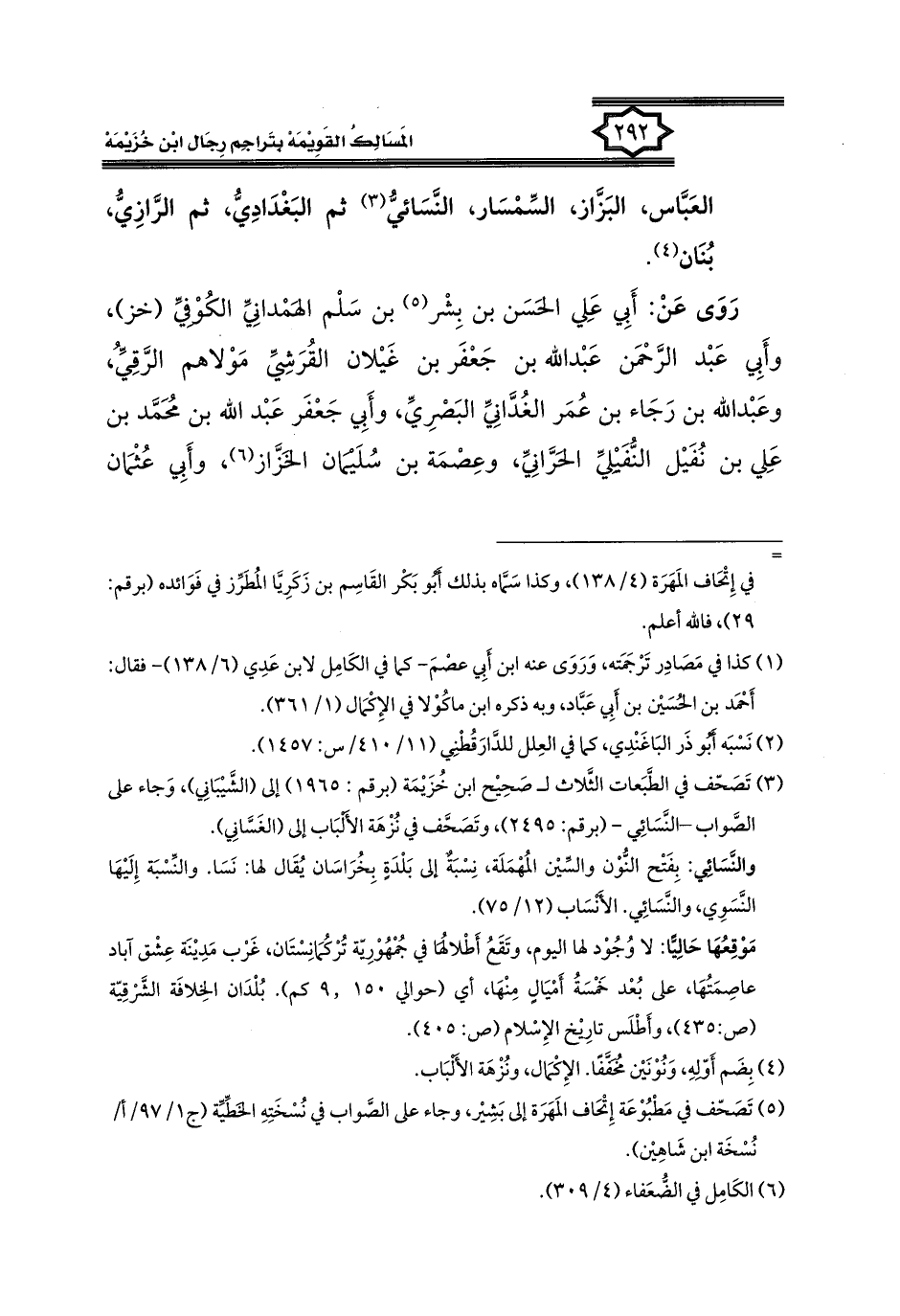 (١) تَصَحّف في الطَّبَعات الثَّلاث لـ صَحِيح ابن خُزَيْمَة (برقم: ١٩٦٥) إلى (الشَّيْبَانِي)، وَجاء على الصَّواب - النَّسَائِي - (برقم: ٢٤٩٥)، وتَصَحَّف في نُزْهَة الأَلْبَاب إلى (الغَسَّانِي).