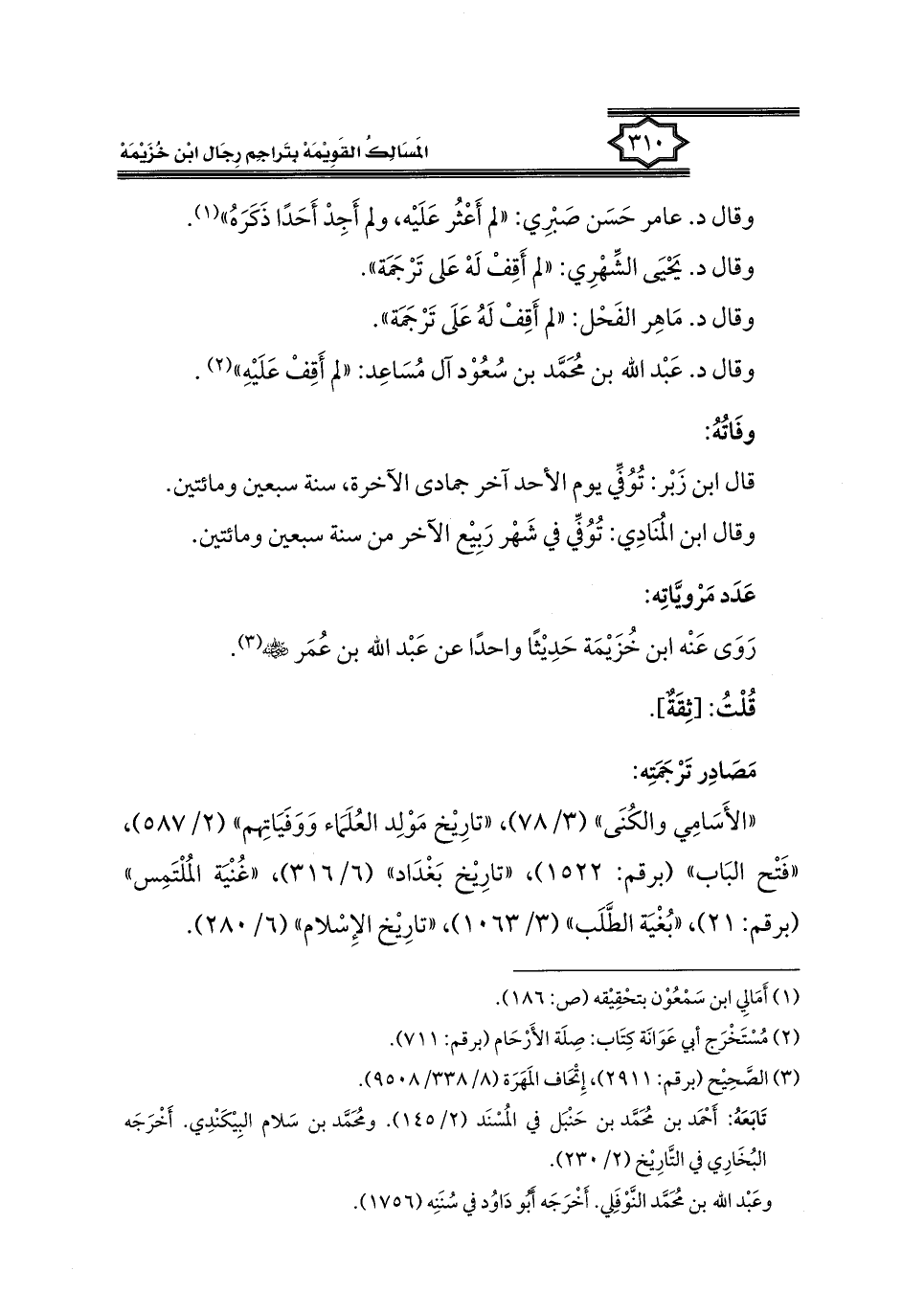 كتاب المسالك القويمة بتراجم رجال ابن خزيمة في الصحيح، والتوحيد، والفوائد (اسم الجزء: 1)