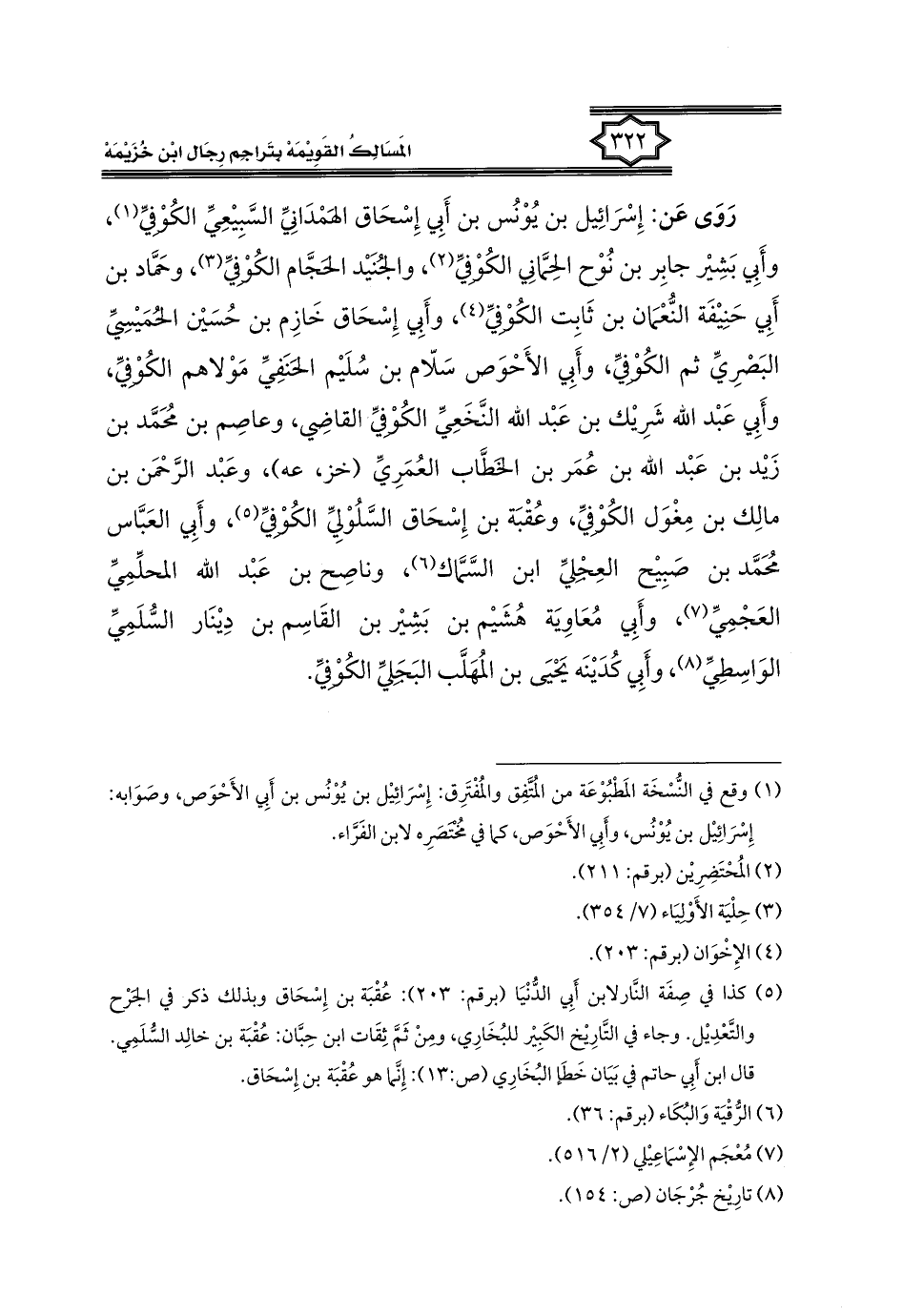 (١) وقع في النُّسْخَة المَطْبُوعَة من المُتَّفِق والمُفْتَرِق: إِسْرَائِيل بن يُوْنُس بن أَبِي الأَحْوَص، وصَوَابه: إِسْرَائِيل بن يُوْنُس، وأَبِي الأَحْوَص، كما في مُختصَرِه لابن الفَرَّاء.