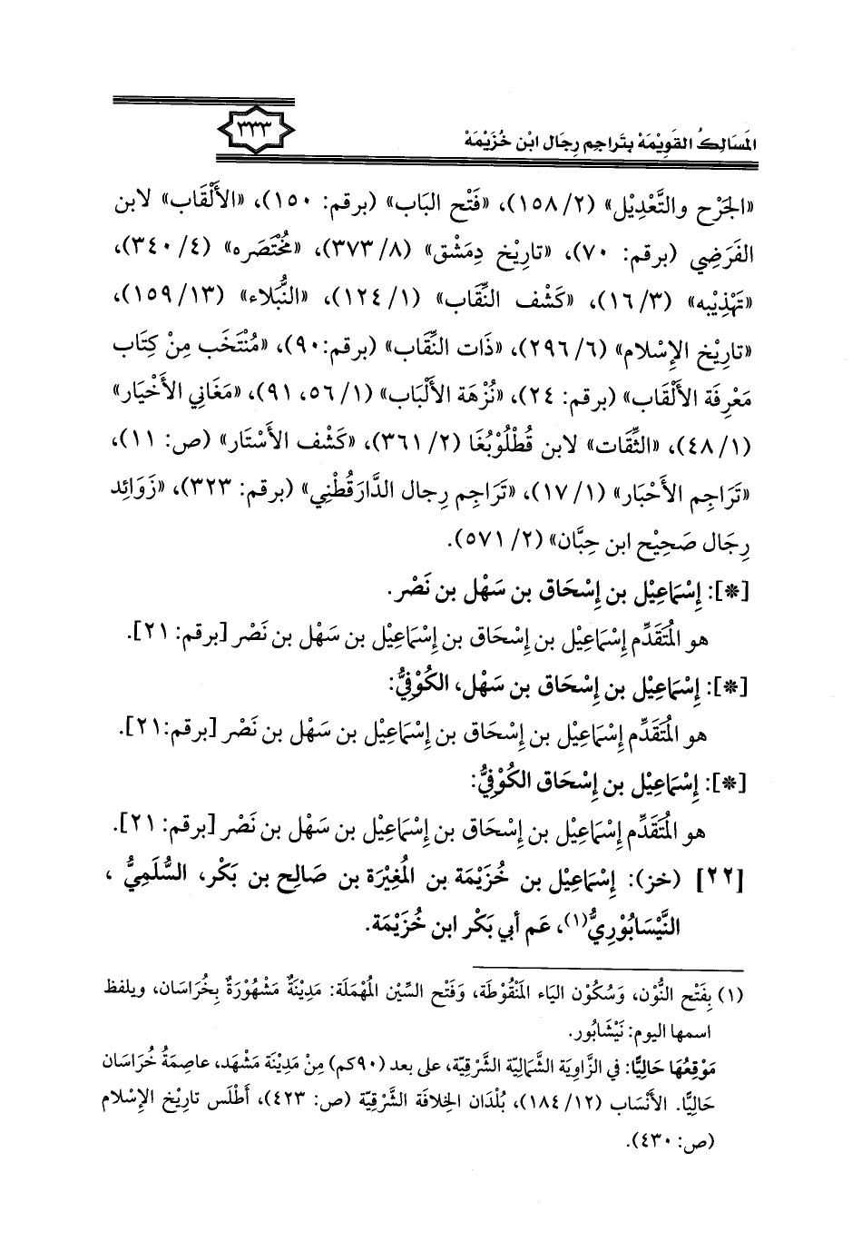[٢٢] (خز): إِسْمَاعِيل بن خُزَيْمَة. بن المُغِيرَة بن صَالِح بن بَكْر، السُّلَمِيُّ، النَّيْسَابُوْرِيُّ (١)، عَم أبي بَكْر بن خُزَيْمَة.