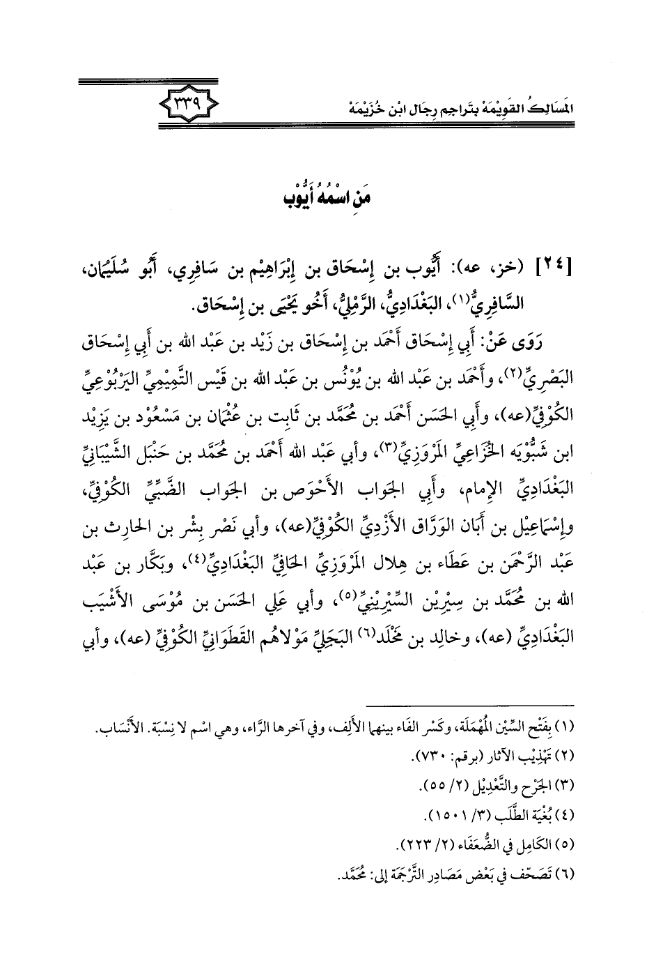 [٢٤] (خز، عه): أَيُّوب بن إِسْحَاق بن إِبْرَاهِيم بن سَافِرِي، أبُو سُلَيْمَان، السَّافِرِيُّ (١)، البَغْدَادِيُّ، الرَّمليُّ، أَخُو يَحْيَى بن إِسْحَاق.