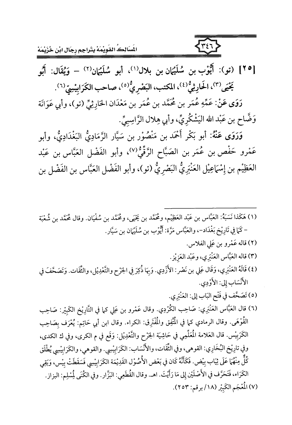 (١) هَكَذا نَسَبَهُ: العَبَّاس بن عَبْد العَظِيم، ومُحَمَّد بن يَحْيَى، ومُحَمَّد بن سُفْيَان. وقال مُحَمَّد بن شُعْبَة - كَمَا فِي تَارِيخ بَغْدَاد -، والعَبَّاس مَرَّة: أيُّوْب بن سُلَيمان بن سَيَّار.