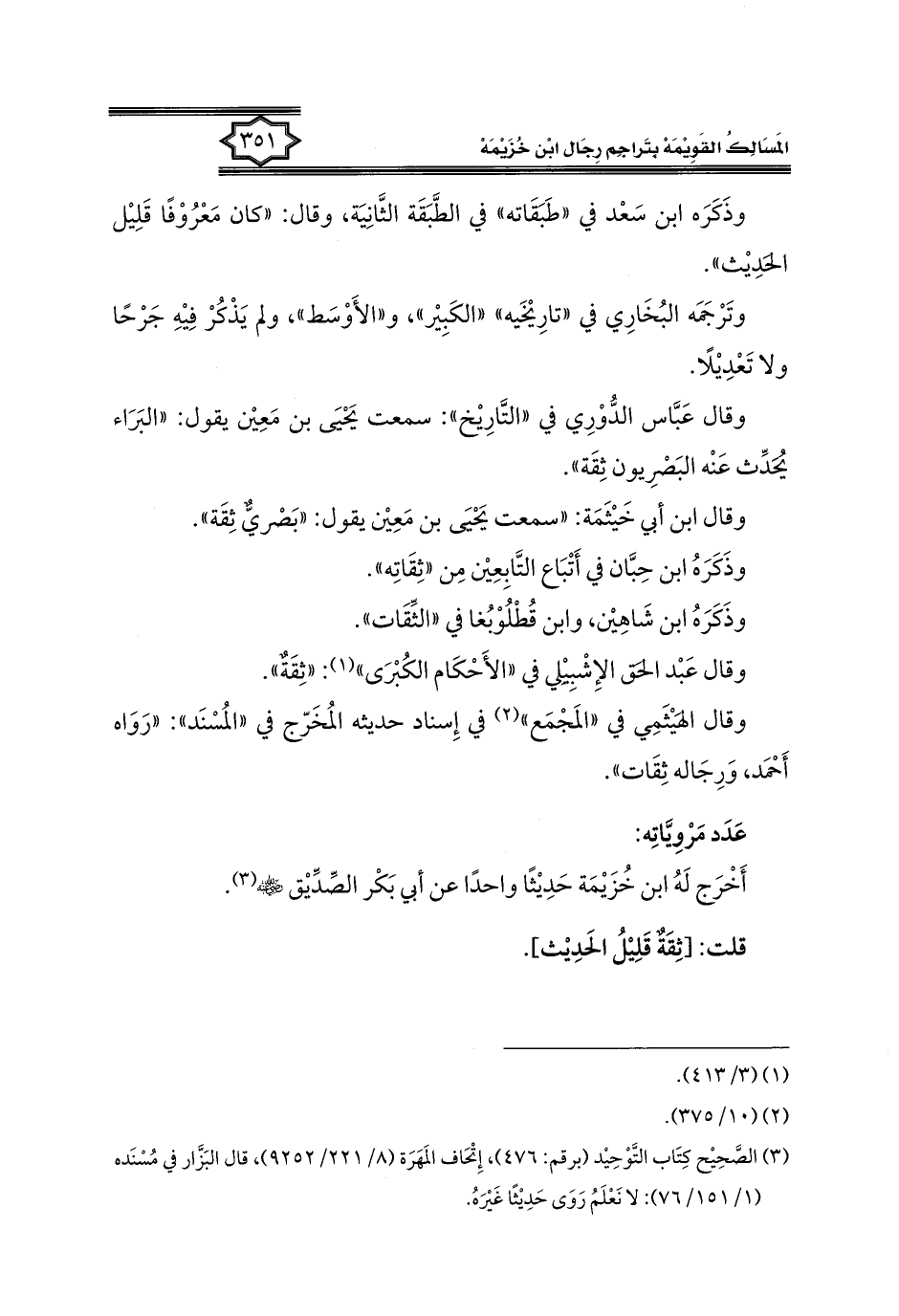 كتاب المسالك القويمة بتراجم رجال ابن خزيمة في الصحيح، والتوحيد، والفوائد (اسم الجزء: 1)