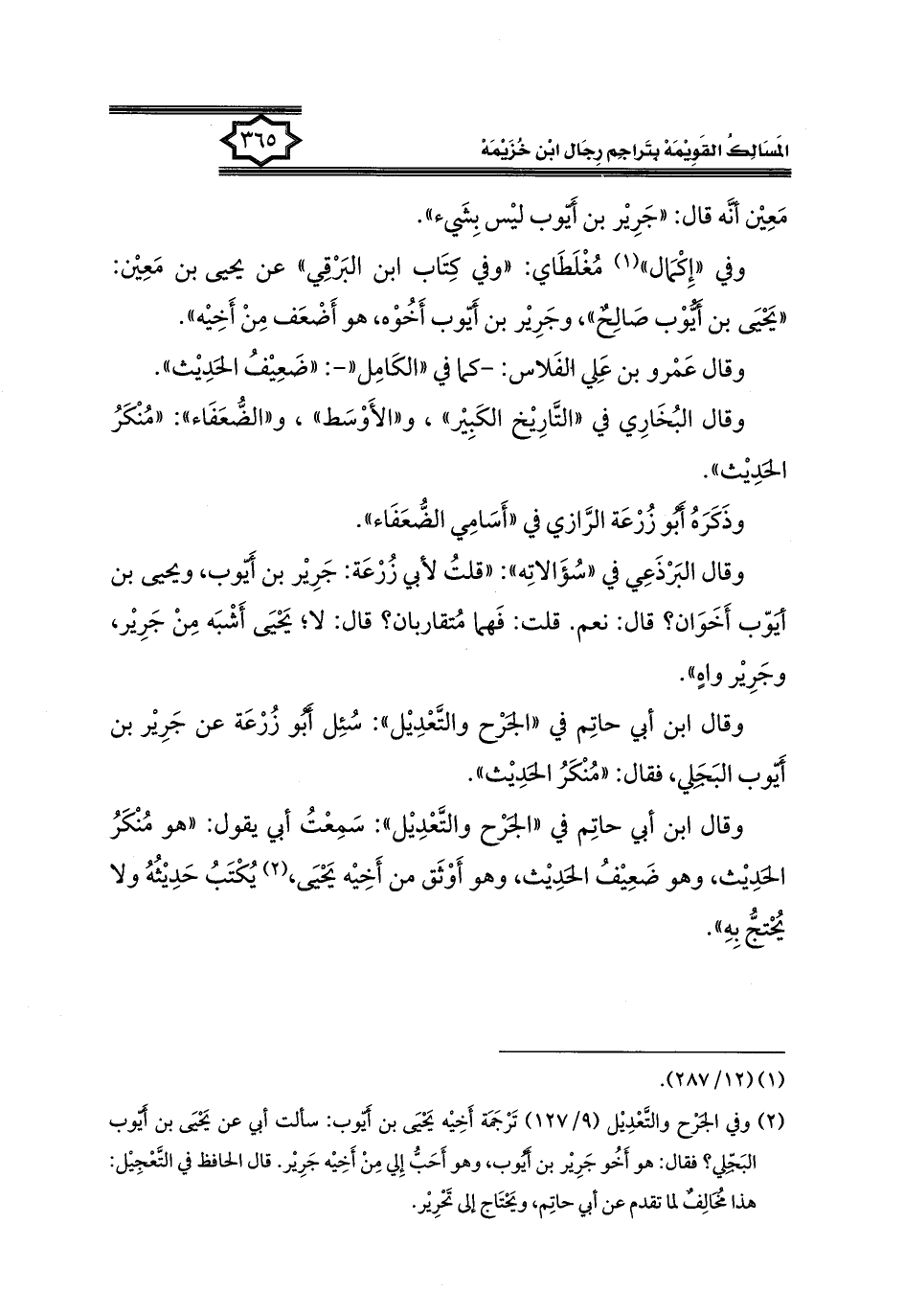 (٢) وفي الجَرْح والتَّعْدِيل (٩/ ١٢٧) تَرْجَمَة أخِيْه يَحْيَى بن أيُّوب: سألت أبي عن يَحْيَى بن أَيُّوب البَجلي؟ فقال: هو أَخُو جَرِير بن أيُّوب، وهو أَحَبُّ إِلي مِنْ أَخِيْه جَرِير. قال الحافظ في التَّعْجِيل: هذا مخالِفٌ لما تقدم عن أبي حاتِم، ويَحْتَاج إلى تَحْرِير.