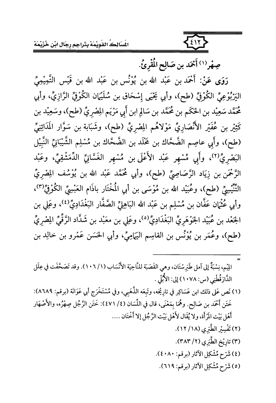 (١) نَص عَلى ذلك ابن عَسَاكِر في تارِيخه، وتَبِعَه الذَّهَبِي، وفي مُسْتَخْرَج أبي عَوَانَة (برقم: ٨٦٨٩): خَتَن أَحْمَد بن صَالِح. وهُمَا بِمَعْنَى، قال في اللِّسَان (٤/ ٤٧١): خَتَن الرَّجُل صِهْرُه، والأَصْهَار أَهْل بَيْت المَرْأَة، ولا يُقَال لأَهْل بَيْت الرَّجُل إلا أَخْتَان ....