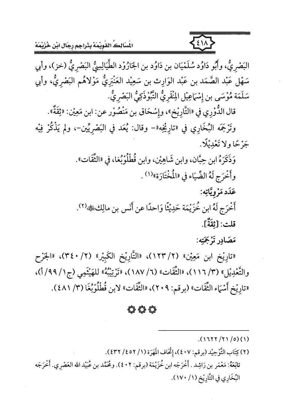 كتاب المسالك القويمة بتراجم رجال ابن خزيمة في الصحيح، والتوحيد، والفوائد (اسم الجزء: 1)