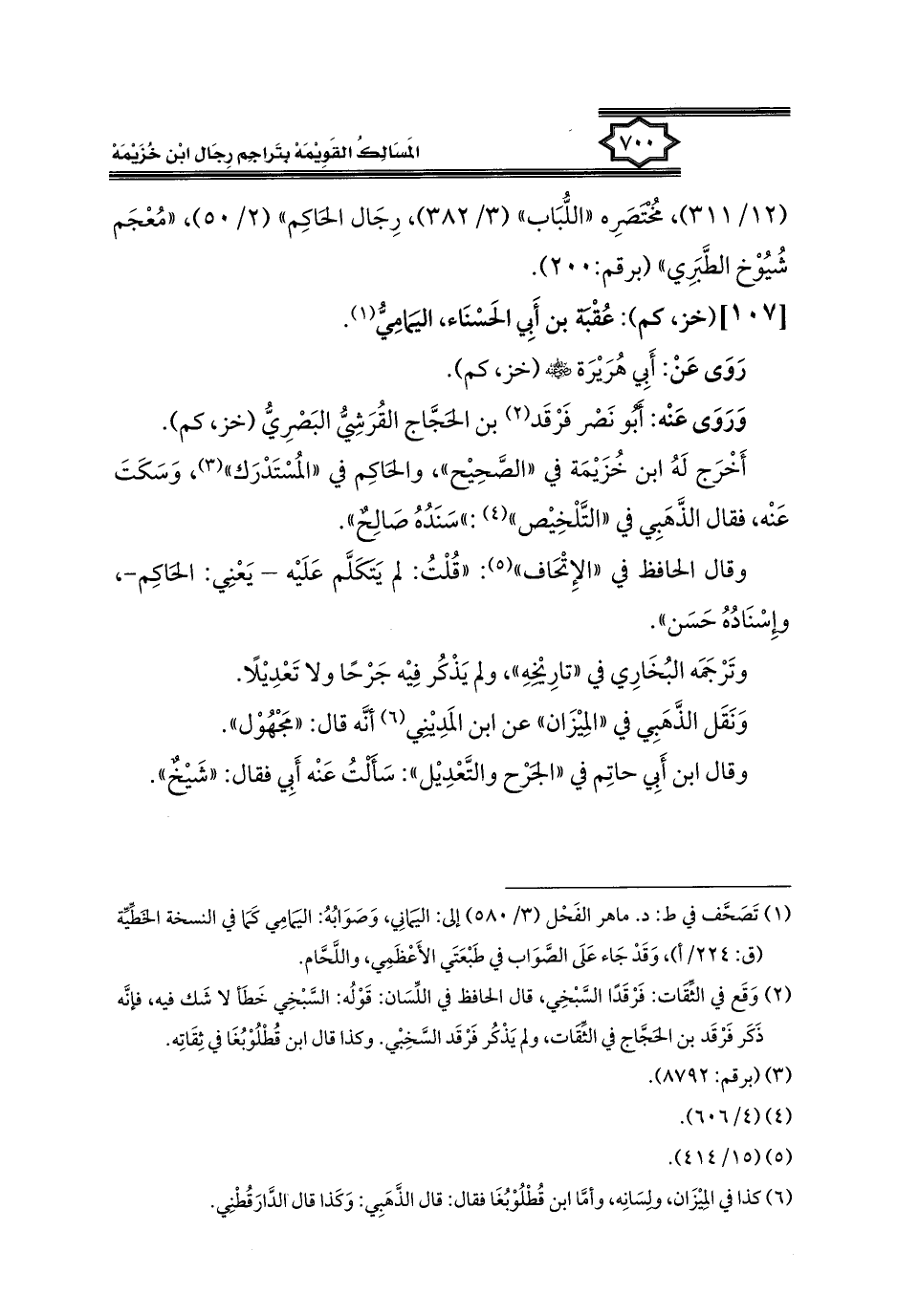 كتاب المسالك القويمة بتراجم رجال ابن خزيمة في الصحيح، والتوحيد، والفوائد (اسم الجزء: 2)
