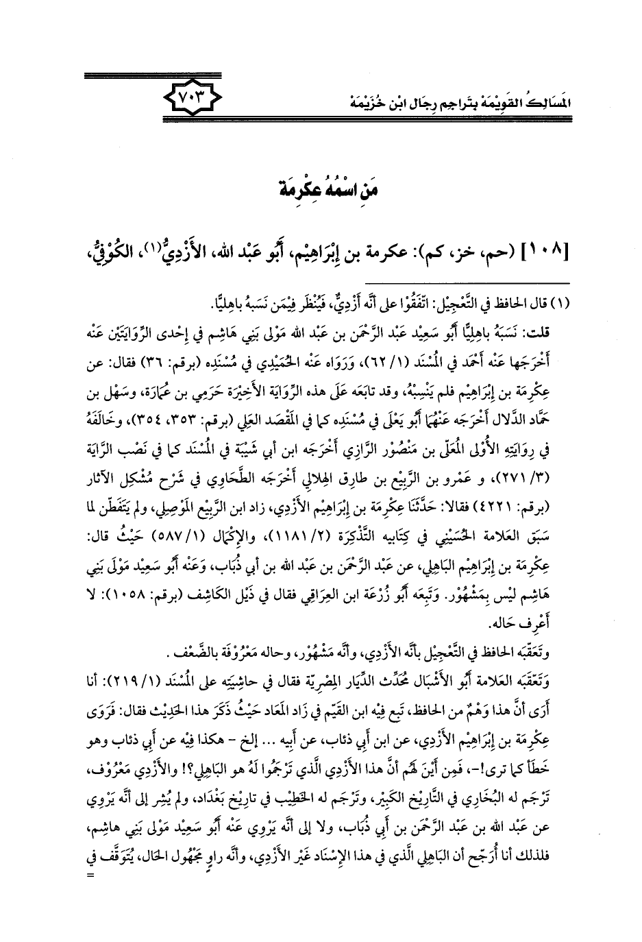 [١٠٨] (حم، خز، كم): عكرمة بن إِبْرَاهِيم، أَبُو عَبْد الله، الأَزْدِيُّ (١)، الكُوفِيُّ،