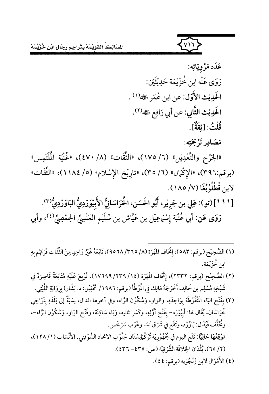 كتاب المسالك القويمة بتراجم رجال ابن خزيمة في الصحيح، والتوحيد، والفوائد (اسم الجزء: 2)