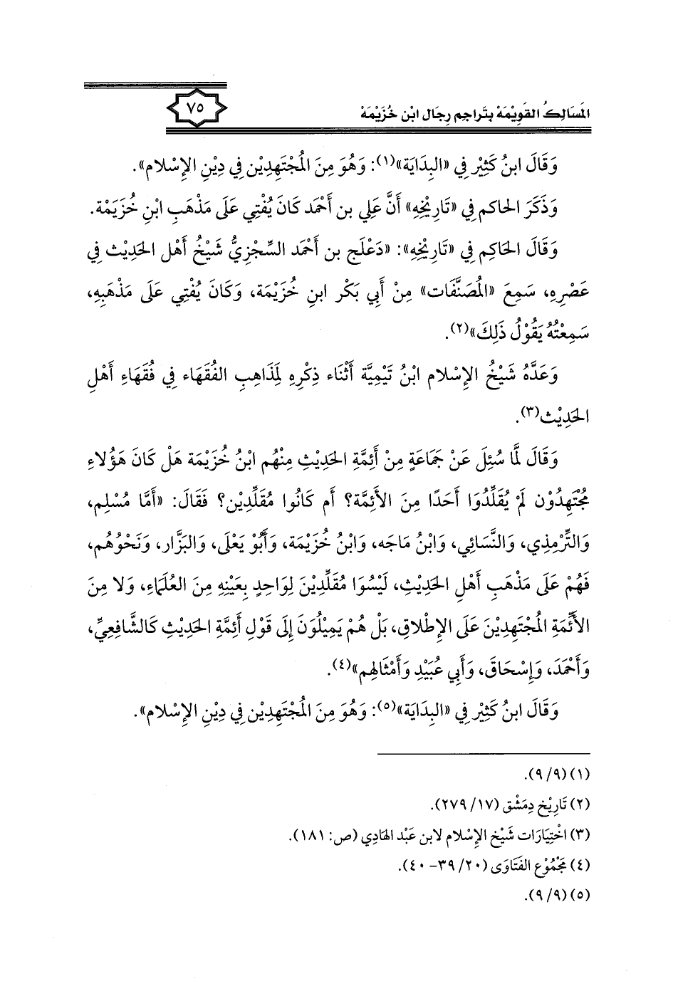 وَقَالَ لمَّا سُئِلَ عَنْ جَمَاعَةٍ مِنْ أَئِمَّةِ الحَدِيثِ مِنْهُم ابْنُ خُزَيْمَة هَلْ كَانَ هَؤُلاءِ مُجتهِدُوْن لَمْ يُقَلِّدُوَا أَحَدًا مِنَ الأَئِمَّة؟ أَم كَانُوا مُقَلِّدِيْن؟ فَقَالَ: "أَمَّا مُسْلِم، وَالتِّرْمِذِي، وَالنَّسَائِي، وَابْنُ مَاجَة، وَابْنُ خُزَيْمَة، وَأَبُوْ يَعْلَى، وَالبَزَّار، وَنَحْوُهُم، فَهُمْ عَلَى مَذْهَبِ أَهْلِ الحَدِيثِ، لَيْسُوَا مُقَلِّدِيْنَ لِوَاحِدٍ بِعَيْنِهِ مِنَ العُلَمَاءِ، وَلا مِنَ الأَئمةِ المُجْتَهِدِيْنَ عَلَى الإِطْلاقِ، بَلْ هُمْ يَمِيْلُوَنَ إِلَى قَوْلِ أَئِمَّةِ الحَدِيثِ كَالشَّافِعِيِّ، وَأَحْمَدَ، وَإِسْحَاقَ، وَأَبِي عُبَيْدِ وَأَمْثَالهِم" (٤).