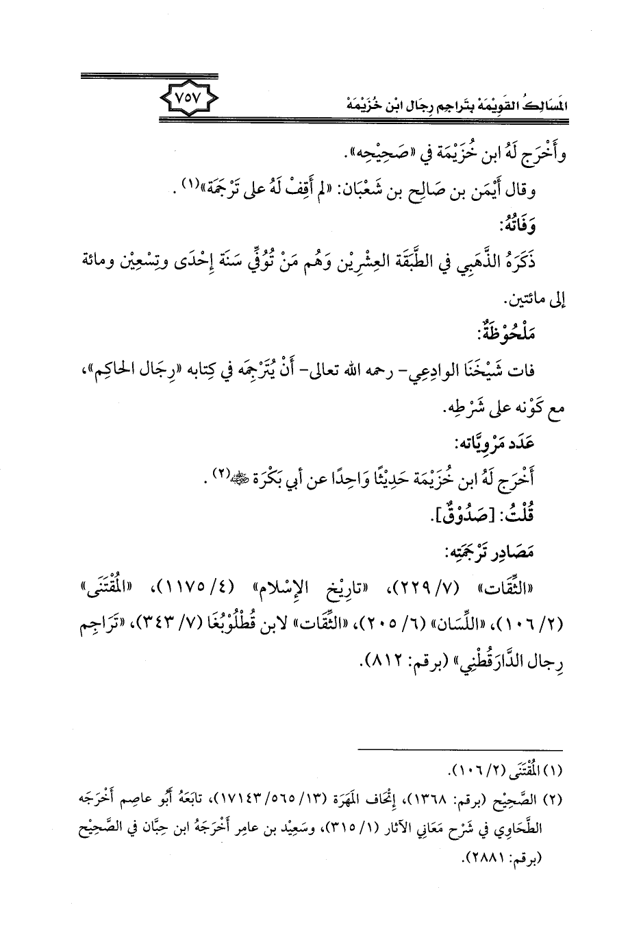 كتاب المسالك القويمة بتراجم رجال ابن خزيمة في الصحيح، والتوحيد، والفوائد (اسم الجزء: 2)