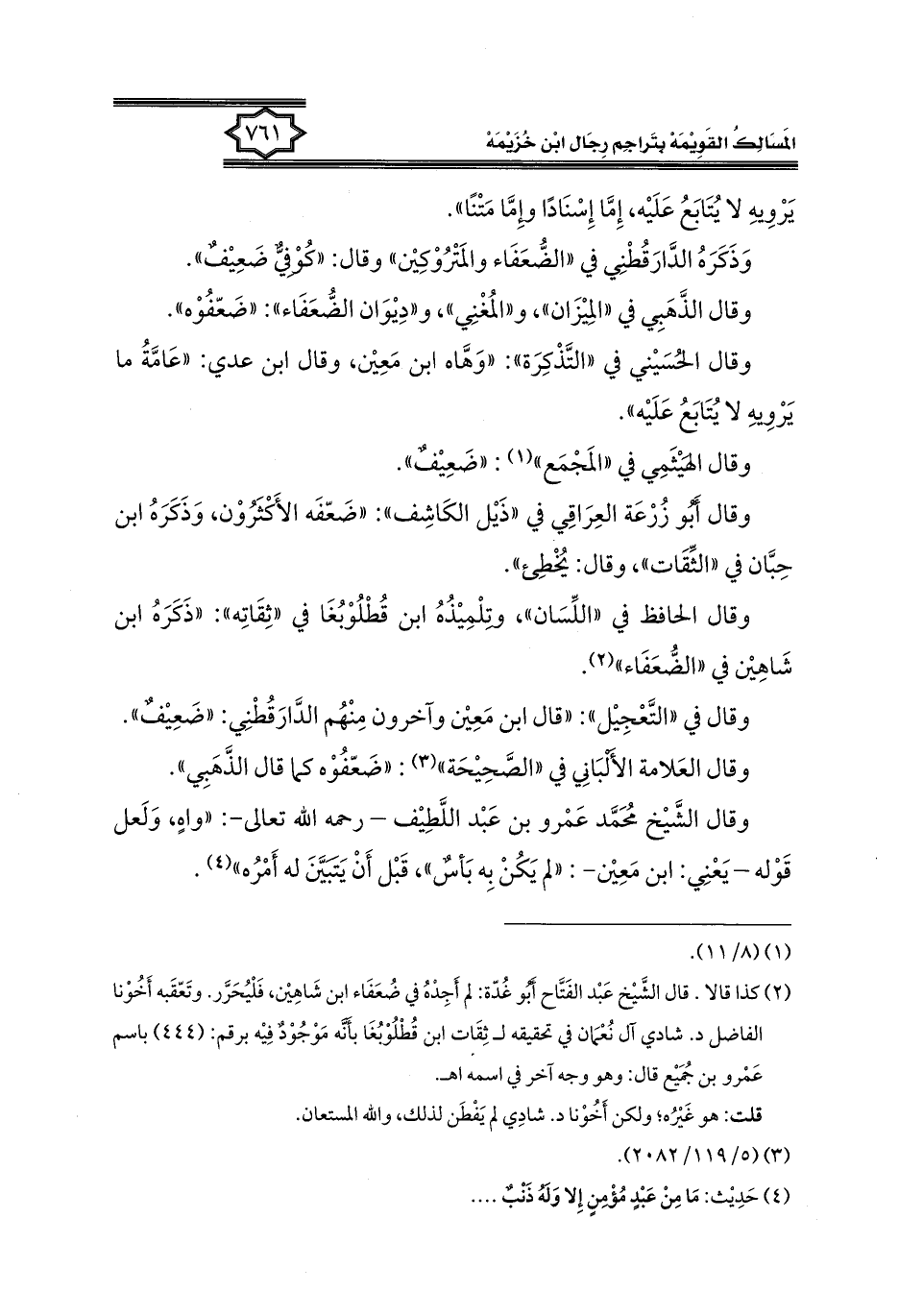 (٢) كذا قالا. قال الشَّيْخ عَبْد الفَتَّاح أَبُو غُدّة: لم أَجِدْهُ في ضُعَفَاء ابن شَاهِين، فَلْيُحَرَّر. وتَعّقَبه أَخُوْنا الفاضل د. شادي آل نُعْمَان في تحقيقه لـ ثِقَات ابن قُطْلُوْبُغَا بأنّه مَوْجُوْدٌ فِيه برقم: (٤٤٤) باسم عَمْرو بن جُمَيْع قال: وهو وجه آخر في اسمه اهـ.
