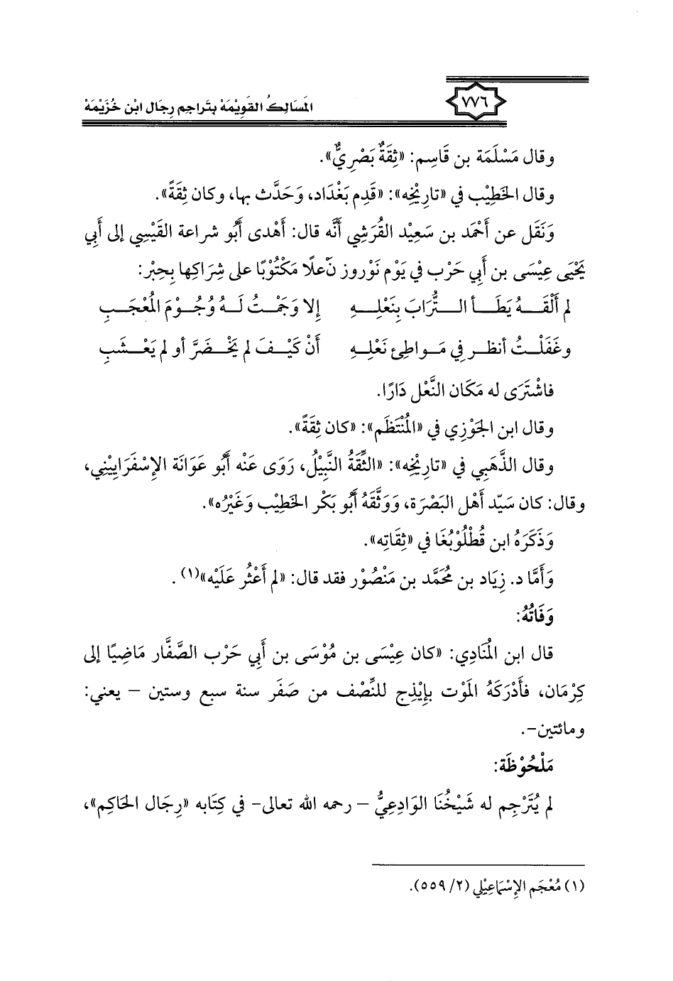 كتاب المسالك القويمة بتراجم رجال ابن خزيمة في الصحيح، والتوحيد، والفوائد (اسم الجزء: 2)