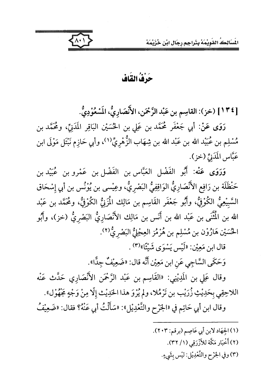 [١٣٤] (خز): القاسِم بن عَبْد الرَّحْمَن، الأَنْصَارِيُّ، المَسْعُوْدِيُّ.