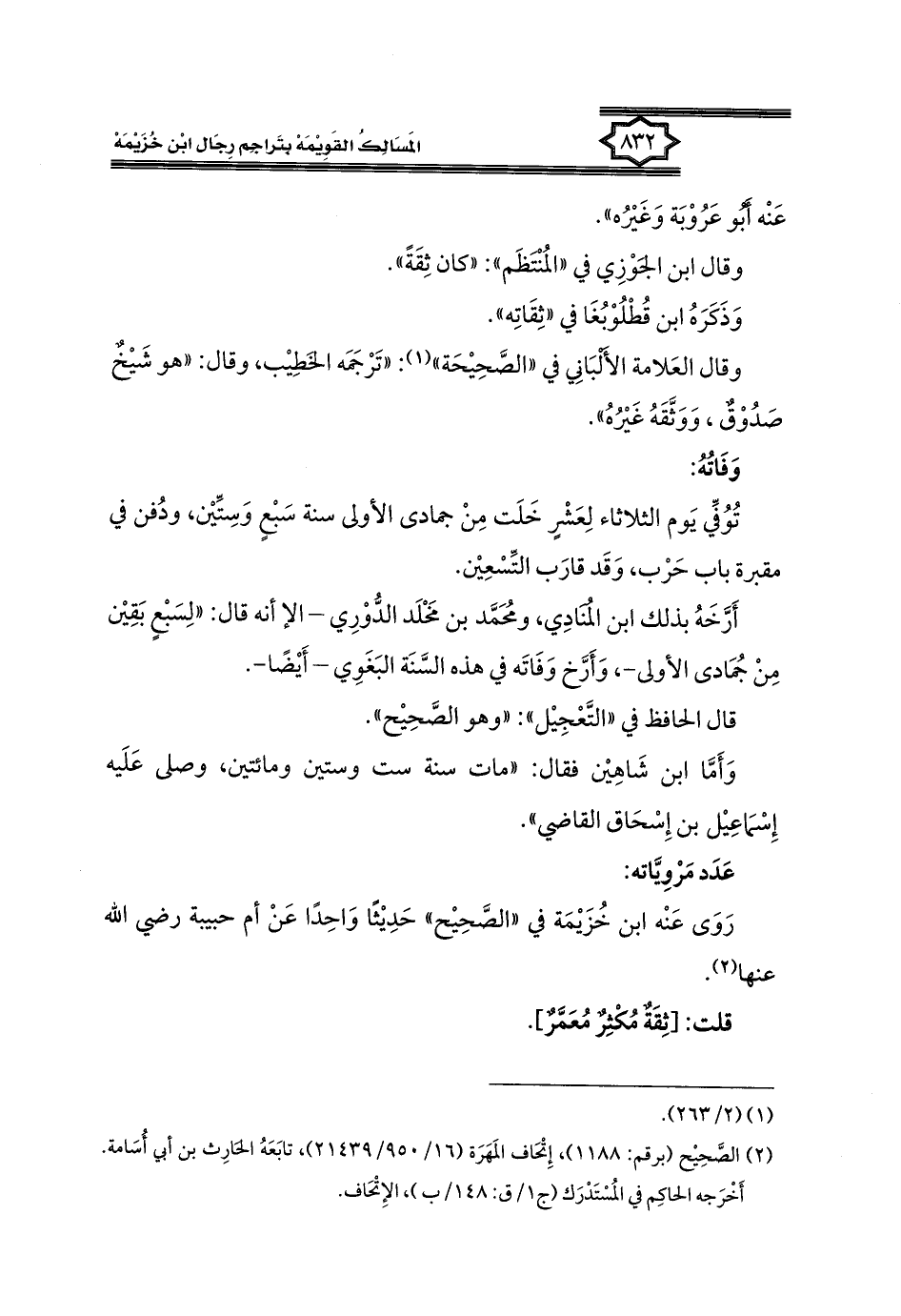 كتاب المسالك القويمة بتراجم رجال ابن خزيمة في الصحيح، والتوحيد، والفوائد (اسم الجزء: 2)