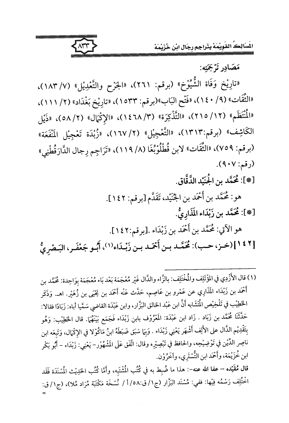 (١) قال الأَزْدِي في المؤْتَلِف والمُخْتَلِف: بالزَّاء والدَّال غَيْر مُعْجَمَة بَعْد بَاء مُعْجَمَة بِوَاحِدة: مُحَمَّد بن أَحْمَد بن زَبْدَاء المَذَارِي عن عَمْرو بن عَاصِم، حَدَّث عَنْه أَحْمَد بن يَحْيَى بن زُهَيْر. اهـ. وَذَكَر الخَطِيب في تَلْخِيص المُتَشَابه أَنَّ ابن عَبْد الخالق البَزَّار، وابن عَبْدَة القاضي سَمَّيا أباه: زَبَادًا فقالا: حَدَّثَنَا مُحَمَّد بن زَبَاد. زَاد ابن عَبْدَة: المَعْرُوْف بابن زَبْدَاء فَجَمَع بَيْنَهُمَا. قال الخَطِيب: وَهُو بِتَقْدِيم الدَّال على الأَلِف أَشْهَر يَعْنِي زَبْدَاء. وَبِمَا سَبَق ضَبَطَهُ ابنُ مَاكُوْلا في الإِكْمَال، وَتَبعَه ابن ناصِر الدِّين في تَوْضِيْحِه، والحافظ في تَبْصِيْرِه وقال: اتَّفَق عَلَى المَشْهُوْر - يَعْنِي: زَبْدَاء - أَبُو بَكْر بن خُزَيْمَة، وأَحْمَد بن التُّسْتَرِي، وآخَرُون.