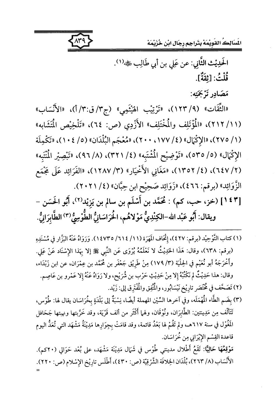 كتاب المسالك القويمة بتراجم رجال ابن خزيمة في الصحيح، والتوحيد، والفوائد (اسم الجزء: 2)