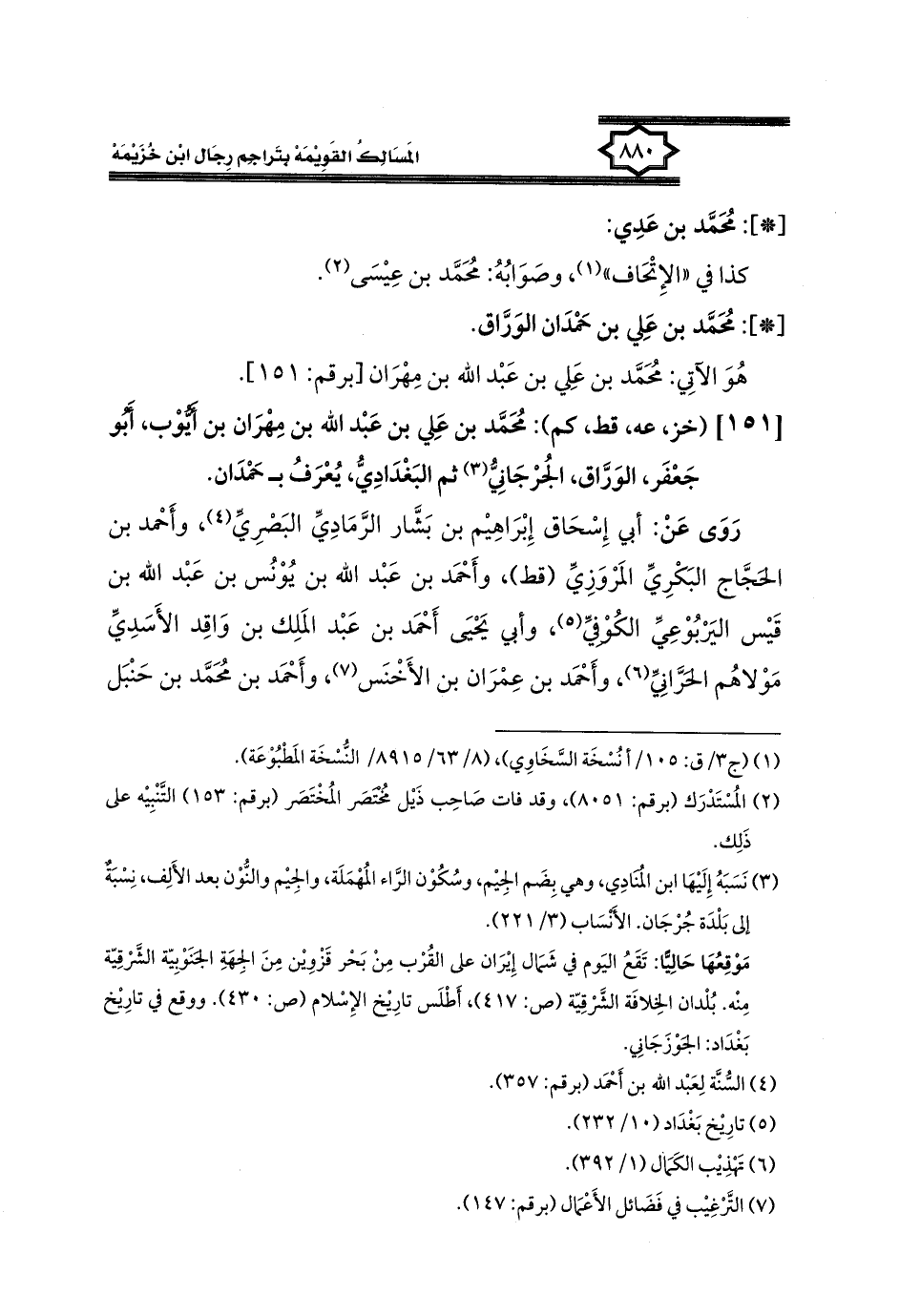 [١٥١] (خز، عه، قط، كم): مُحَمَّد بن عَلي بن عَبْد الله بن مِهْرَان بن أَيُّوب، أَبُو جَعْفَر، الوَرَّاق، الجُرْجَانِيُّ (٣) ثم البَغْدَادِيُّ، يُعْرَفُ بـ حَمْدَان.