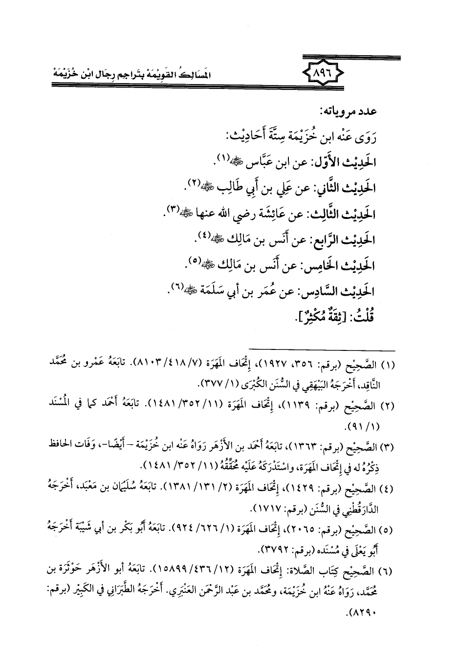 (٦) الصَّحِيح كِتَاب الصَّلاة: إِتْحَاف المَهَرَة (١٢/ ٤٣٦/ ١٥٨٩٩). تابَعَهُ أَبُو الأَزْهَر حَوْثَرَة بن مُحَمَّد، رَوَاهُ عَنْهُ ابن خُزَيْمَة، ومُحَمَّد بن عَبْد الرَّحْمَن العَنْبَرِي. أَخْرَجَهُ الطَّبَرَانِي في الكَبِير (برقم: ٨٢٩٠).