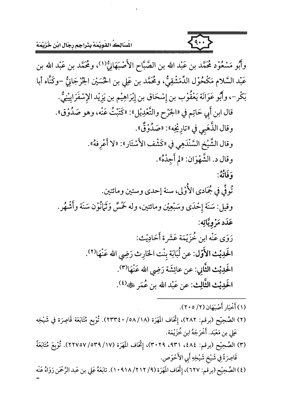 كتاب المسالك القويمة بتراجم رجال ابن خزيمة في الصحيح، والتوحيد، والفوائد (اسم الجزء: 2)