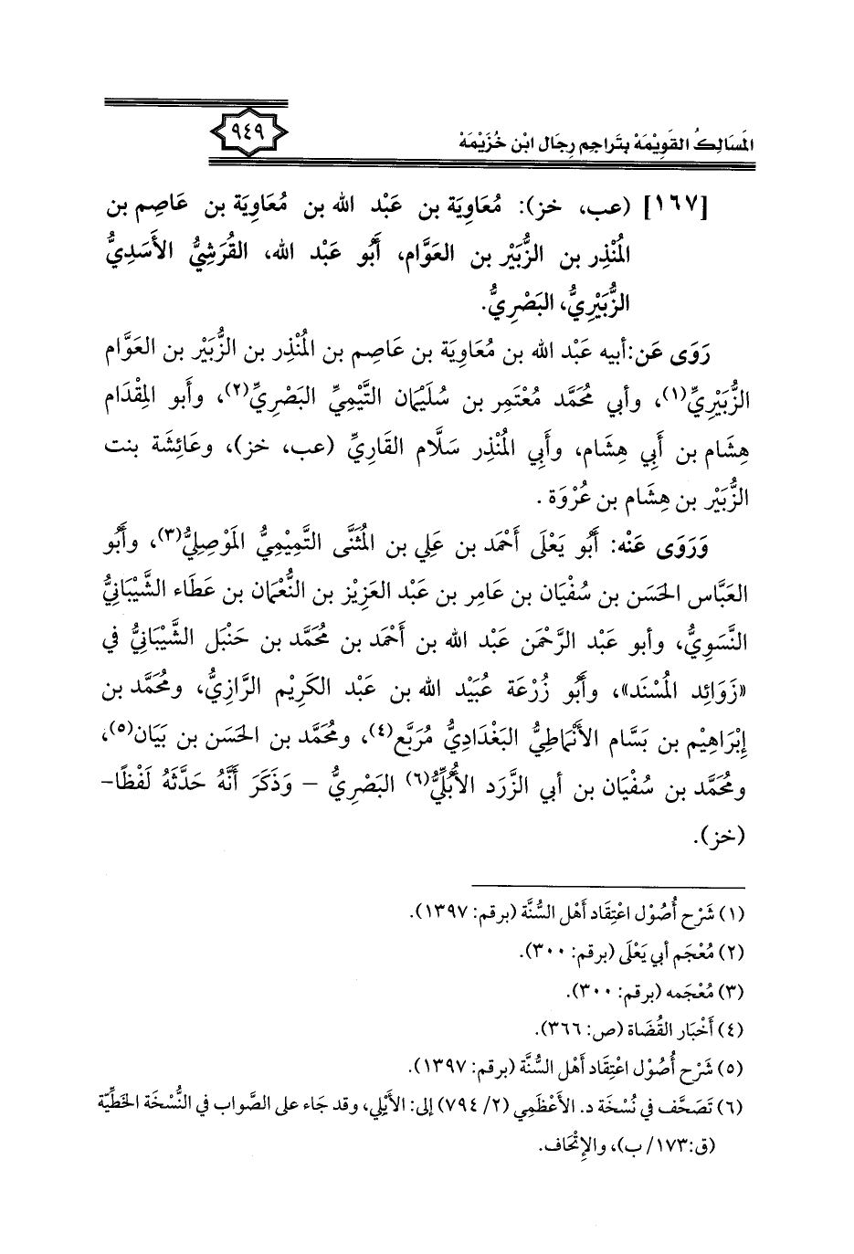 [١٦٧] (عب، خز): مُعَاوِيَة بن عَبْد الله بن مُعَاوِيَة بن عَاصِم بن المُنْذِر بن الزُّبَيْر بن العَوَّام، أبُو عَبْد الله، القُرَشِيّ الأَسَدِيُّ الزُّبَيْريُّ، البَصْرِيُّ.