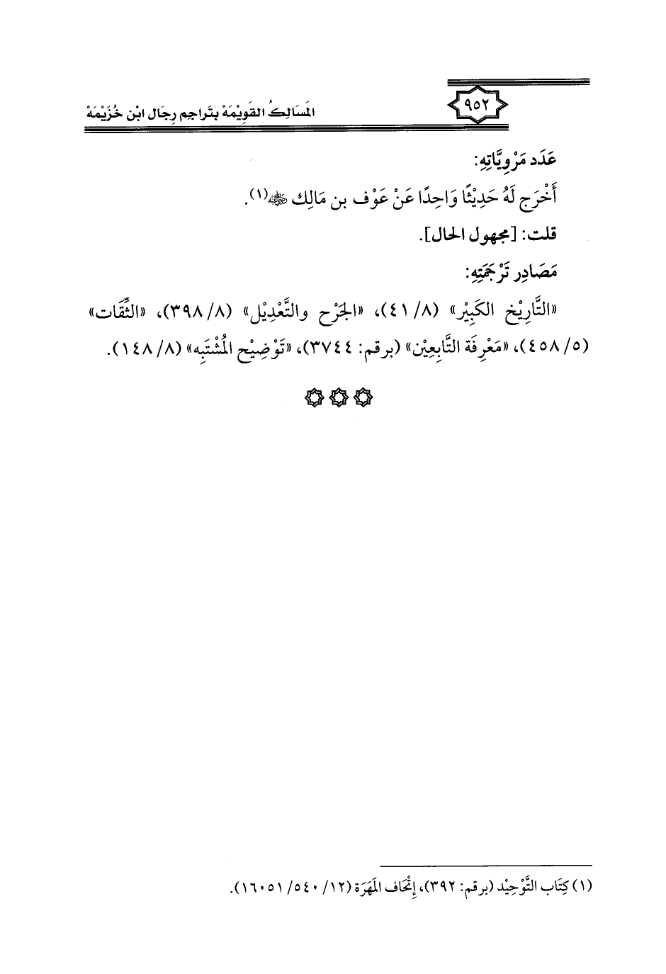 (١) كِتَاب التَّوْحِيد (برقم: ٣٩٢)، إِتْحَاف المَهَرَة (١٢/ ٥٤٠/ ١٦٠٥١).