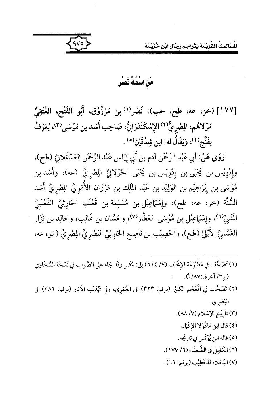 [١٧٧] (خز، عه، طح، حب): نَصْر (١) بن مَرْزُوْق، أَبُو الفَتْح، العُتَقِيُّ مَوْلاهُم، المِصْرِيُّ (٢) الإِسْكَنْدَرَانِيُّ، صَاحِب أَسَد بن مُوْسَى (٣)، يُعْرَفُ بفَنَّج (٤)، وَيُقَالُ له: ابن شِدْقَيْن (٥).