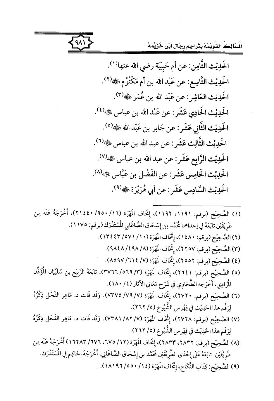 (٧) الصَّحِيح (برقم: ٢٧٢٨)، إِتْحَاف المَهَرَة (٧/ ٨٢/ ٧٣٨١). وَقَد فَات د. مَاهِر الفَحْل ذِكْرُهُ لِرَقَم هذا الحَدِيث في فِهْرس الشُّيوخ (٥/ ٢٦٢).