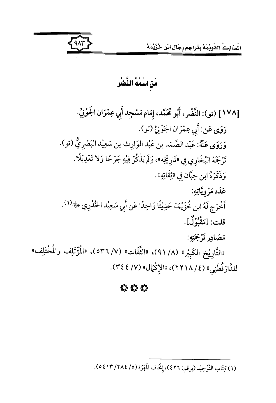 [١٧٨] (تو): النَّضْر، أَبُو مُحَمَّد، إِمَام مَسْجِد أَبِي عِمْرَان الجَوْنِيِّ.