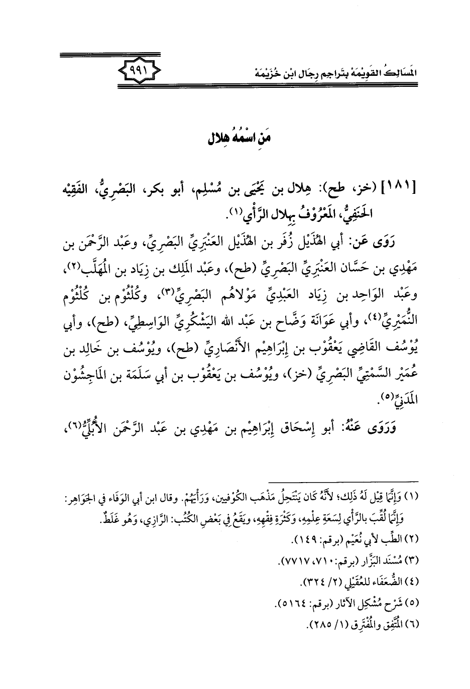 [١٨١] (خز، طح): هِلال بن يَحْيَى بن مُسْلِم، أبو بكر، البَصْرِيُّ، الفَقِيه الحَنَفِيُّ، المَعْرُوفُ بِهِلال الرَّأْي (١).