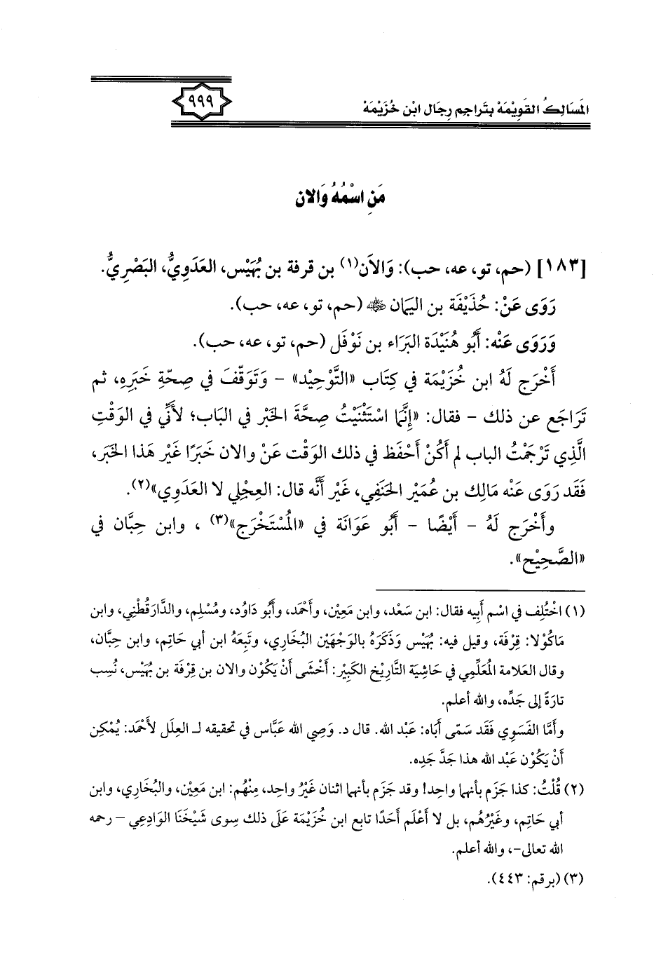 (٢) قُلْتُ: كذا جَزَم بأنهما واحِد! وقد جَزَم بأنهما اثنان غَيْرُ واحِد، مِنْهُم: ابن مَعِين، والبُخَارِي، وابن أبي حَاتِم، وغَيْرُهُم، بل لا أَعْلَم أَحَدًا تابع ابن خُزَيْمَة عَلَى ذلك سِوى شَيْخَنَا الوَادِعِي - رحمه الله تعالى -، والله أعلم.