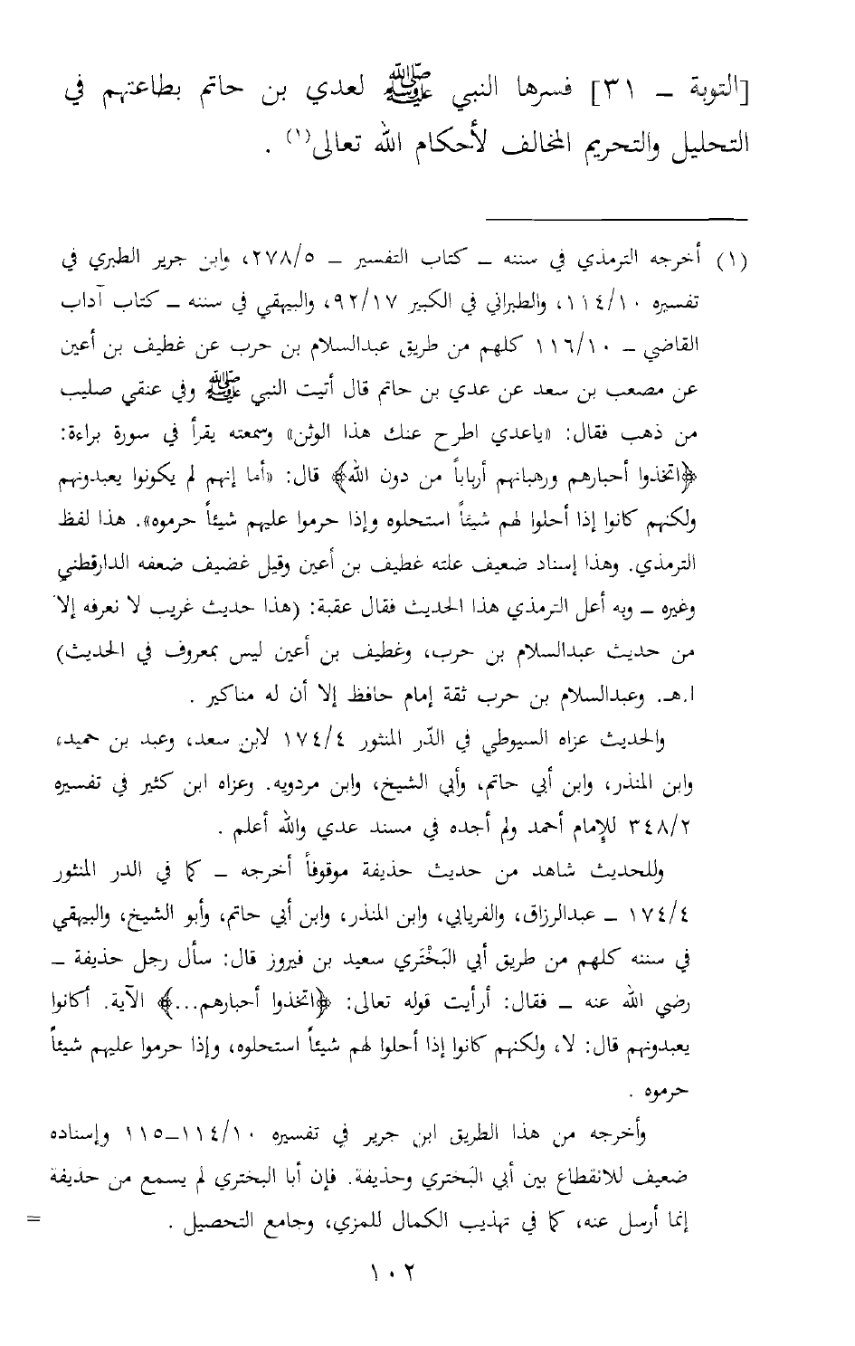 1 أخرجه الترمذي في سننه –كتاب التفسير- 5/ 278، وابن جرير الطبري في تفسيره 10/ 114، والطبراني في الكبير 17/ 92، والبيهقي في سننه –كتاب آداب القاضي- 10/ 116 كلهم من طريق عبد السلام بن حرب عن غطيف بن أعين عن مصعب بن سعد عن عدي بن حاتم قال: أتيت النبي صلى الله عليه وسلم وفي عنقي صليب من ذهب فقال: "يا عدي اطرح عنك هذا الوثن" وسمعته يقرأ في سورة براءة {اتَّخَذُوا أَحْبَارَهُمْ وَرُهْبَانَهُمْ أَرْبَاباً مِنْ دُونِ اللَّهِ} . قال: "أما، إنهم لم يكونوا يعبدونهم، ولكنهم كانوا إذا أحلوا لهم شيئاً استحلوه، وإذا حرموا عليهم شيئاً حرموه". هذا لفظ الترمذي. وهذا إسناد ضعيف علته غطيف بن أعين وقيل غضيب، ضعفه الدراقطني وغيره –وبه أعل الترمذي هذا الحديث فقال عقبه: "هذا حديث غريب لا نعرفه إلا من حديث عبد السلام بن حرب، وغطيف بن أعين ليس بمعروف في الحديث" اهـ. وعبد السلام بن حرب ثقة إمام حافظ إلا أن له مناكير.