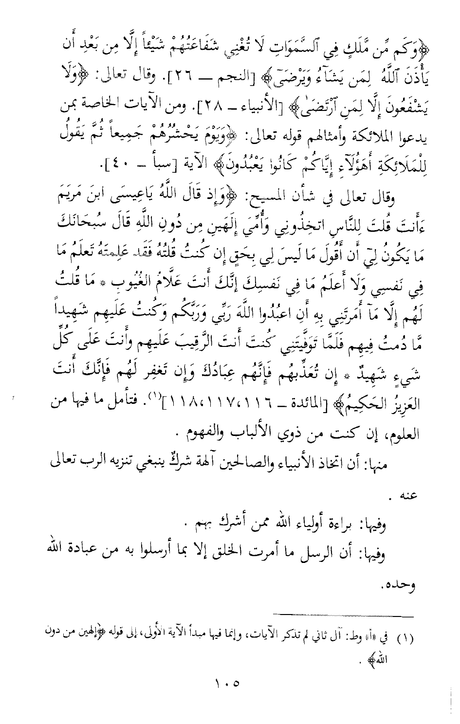 وقال تعالى في شأن المسيح: {وَإِذْ قَالَ اللهُ يَا عِيسَى ابْنَ مَرْيَمَ أَأَنتَ قُلتَ لِلنَّاسِ اتَّخِذُونِي وَأُمِّيَ إِلَهَيْنِ مِن دُونِ اللهِ قَالَ سُبْحَانَكَ مَا يَكُونُ لِي أَنْ أَقُولَ مَا لَيْسَ لِي بِحَقٍّ إِن كُنتُ قُلْتُهُ فَقَدْ عَلِمْتَهُ تَعْلَمُ مَا فِي نَفْسِي وَلاَ أَعْلَمُ مَا فِي نَفْسِكَ إِنَّكَ أَنتَ عَلاَّمُ الْغُيُوبِ*مَا قُلْتُ لَهُمْ إِلاَّ مَا أَمَرْتَنِي بِهِ أَنِ اعْبُدُواْ اللهَ رَبِّي وَرَبَّكُمْ وَكُنتُ عَلَيْهِمْ شَهِيدًا مَّا دُمْتُ فِيهِمْ فَلَمَّا تَوَفَّيْتَنِي كُنتَ أَنتَ الرَّقِيبَ عَلَيْهِمْ وَأَنتَ عَلَى كُلِّ شَيْءٍ شَهِيدٌ*إِن تُعَذِّبْهُمْ فَإِنَّهُمْ عِبَادُكَ وَإِن تَغْفِرْ لَهُمْ فَإِنَّكَ أَنتَ الْعَزِيزُ الْحَكِيمُ} . [المائدة: 116، 117، 118] 1. فتأمل ما فيها من العلوم، إن كنت من ذوي الألباب والفهوم.