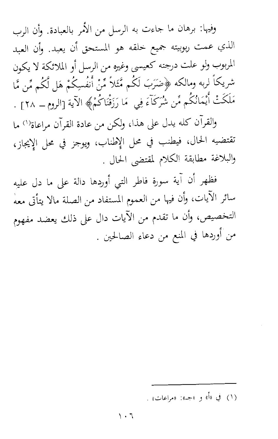 وفيها: برهان ما جاءت به الرسل من الأمر بالعبادة. وأن الرب الذي عمت ربوبيته جميع خلقه هو المستحق أن يعبد. وأن العبد المربوب ولو علت درجته كعيسى وغيره من الرسل أو الملائكة لا يكون شريكاً لربه ومالكه {ضَرَبَ لَكُم مَّثَلًا مِنْ أَنفُسِكُمْ هَل لَّكُم مِّن مَّا مَلَكَتْ أَيْمَانُكُم مِّن شُرَكَاء فِي مَا رَزَقْنَاكُمْ} . الآية [الروم:28] .