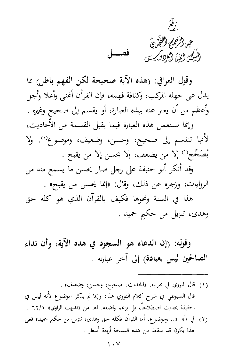 2 في "أ": " ... وموضوع، أما القرآن فكله حق وهدى، تنزيل من حكيم حميد" فعلى هذا يكون قد سقط من هذه النسخة أربعة أسطر.