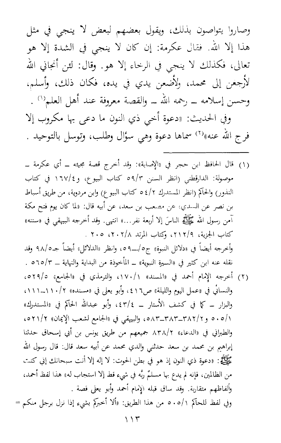 وصاروا يتواصون بذلك، ويقول بعضهم لبعض لا ينجي في مثل هذا إلا الله. فقال عكرمة: إن كان لا ينجي في الشدة إلا هوتعالى، فكذلك لا ينجي في الرخاء إلا هو. وقال: لئن أنجاني الله لأرجعن إلى محمد، ولأضعن يدي في يده، فكان ذلك، وأسلم وحسن إسلامه –رحمه الله- والقصة معروفة عند أهل العلم1.