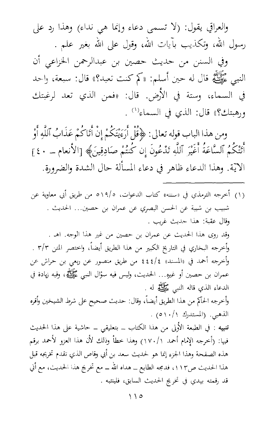 والعراقي يقول: (لا تسمى دعاء وإنما هي نداء) وهذا رد على رسول الله، وتكذيب بآيات الله، وقول على الله بغير علم.
